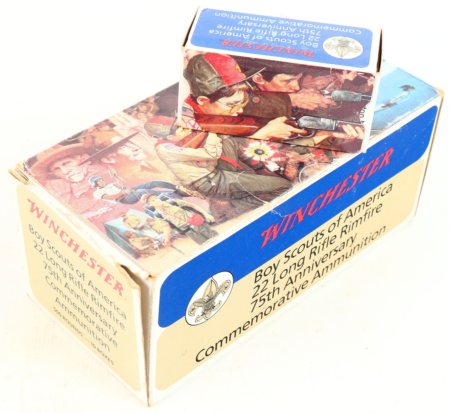 Winchester, Boy Scouts of America 75th Anniversary, .22 Long Rifle, High Velocity, Partial 5, 1pc. Multi-colored brick featuring pictures of Boy Scouts, brick is solid with excellent color, some edge & corner wear, end flaps are solid, inside boxes are minty. Grade: Very Good + - Value: 20 to 80