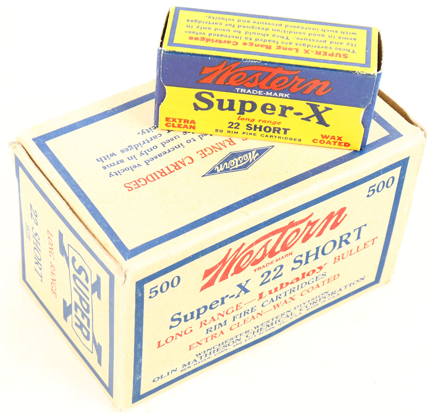 Western, Super-X, .22 Short, Extra Clean Wax Coated, Full, 500rds. 1pc. Buff blue & red brick, brick is solid with excellent to minty color, minor edge & corner wear, end flaps are solid, inside boxes are minty. Grade: Excellent + - Value: 50 to 600