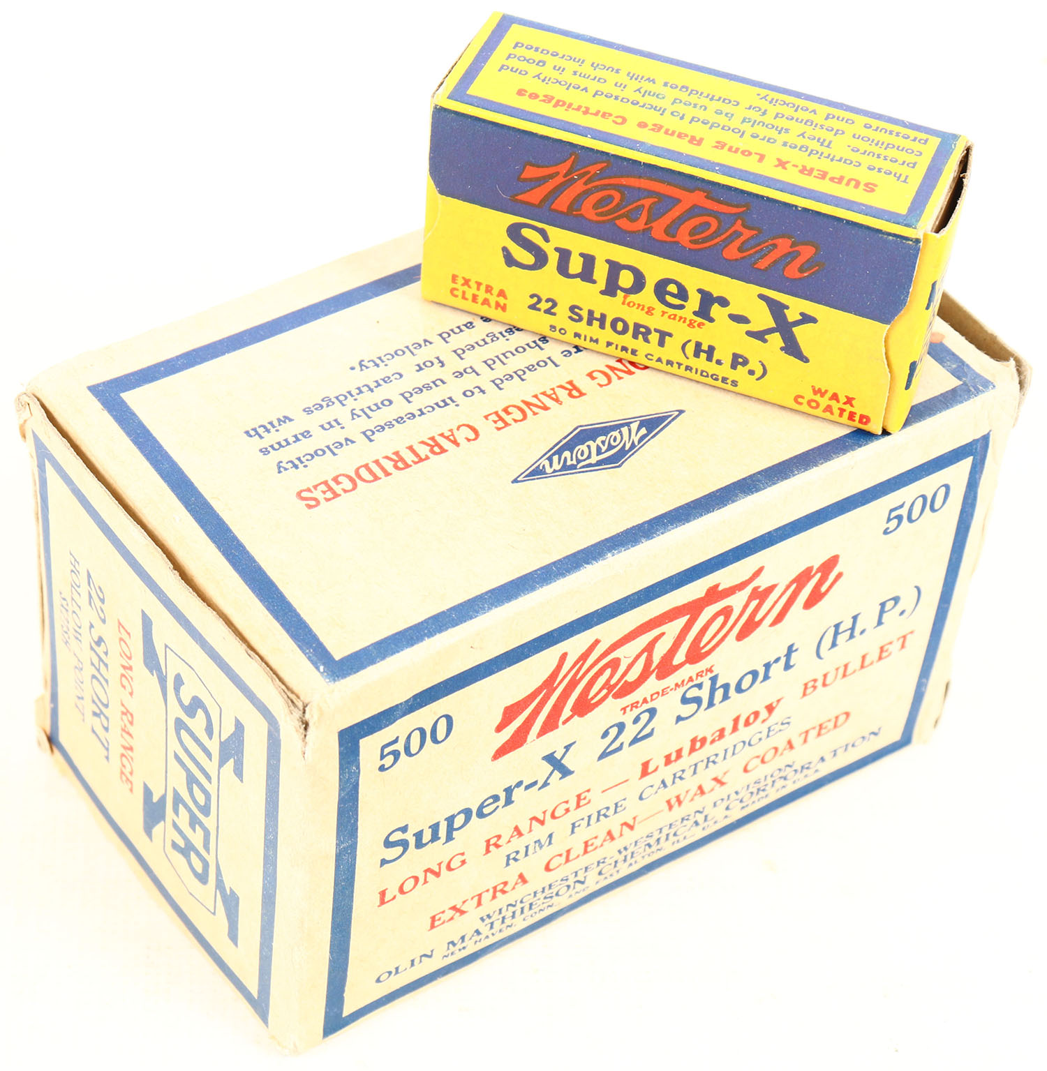Western, Super-X, .22 Short Hollow Point, Extra Clean Wax Coated, Full, 500rds. 1pc. Buff blue & red brick, brick is solid with excellent to minty color, corner wear, minor edge wear, end flaps are solid, inside boxes are excellent to minty. Grade: Excellent - Value: 150 to 800
