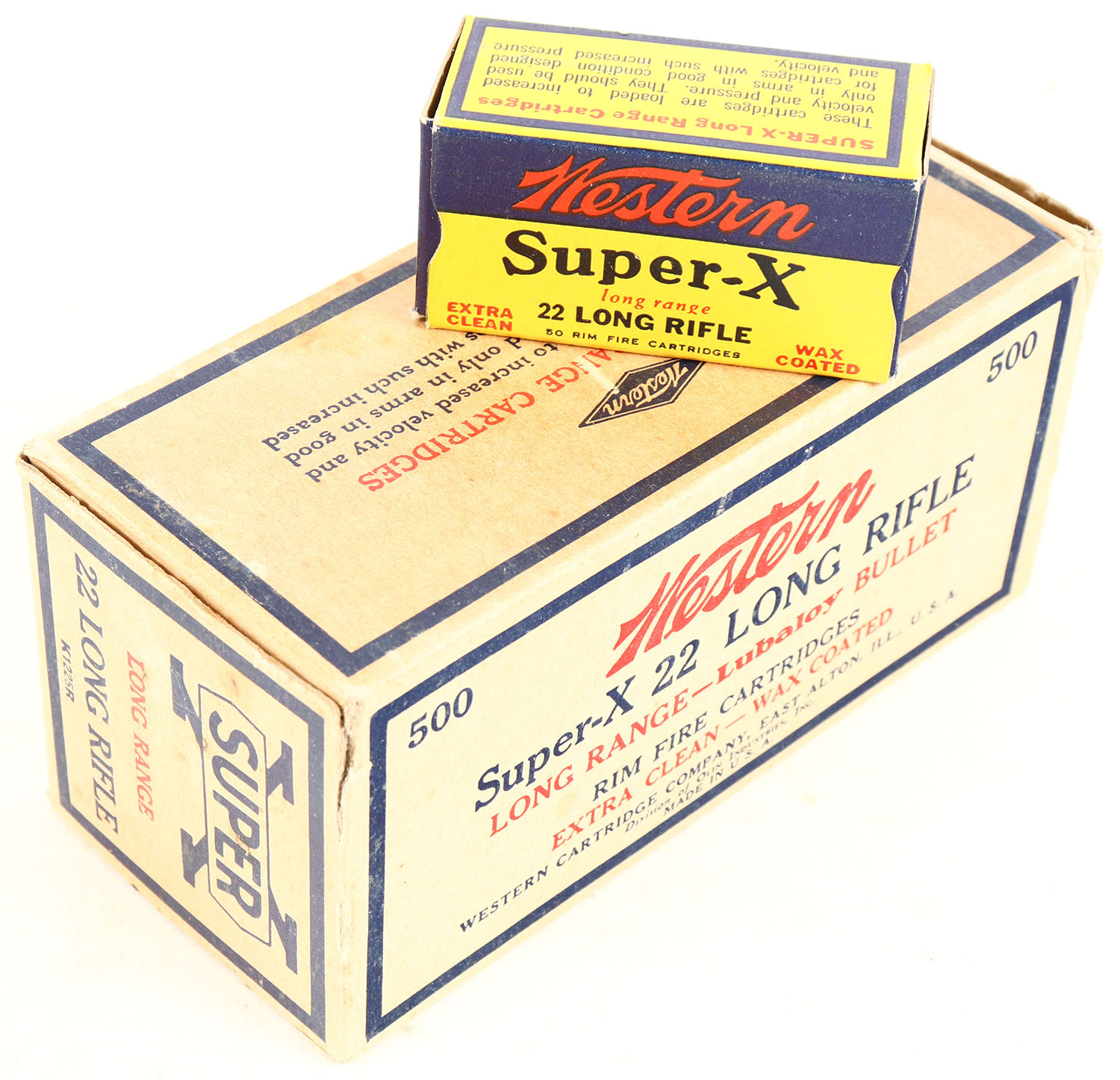 Western, Super-X, .22 Long Rifle, Extra Clean Wax Coated, Full, 500rds. 1pc. Buff blue & red brick, brick is solid with excellent color, very minor age soiling & shelf wear, some corner wear, edges are mostly crisp, end flaps are solid, inside boxes are minty. Grade: Excellent - Value: 80 to 240