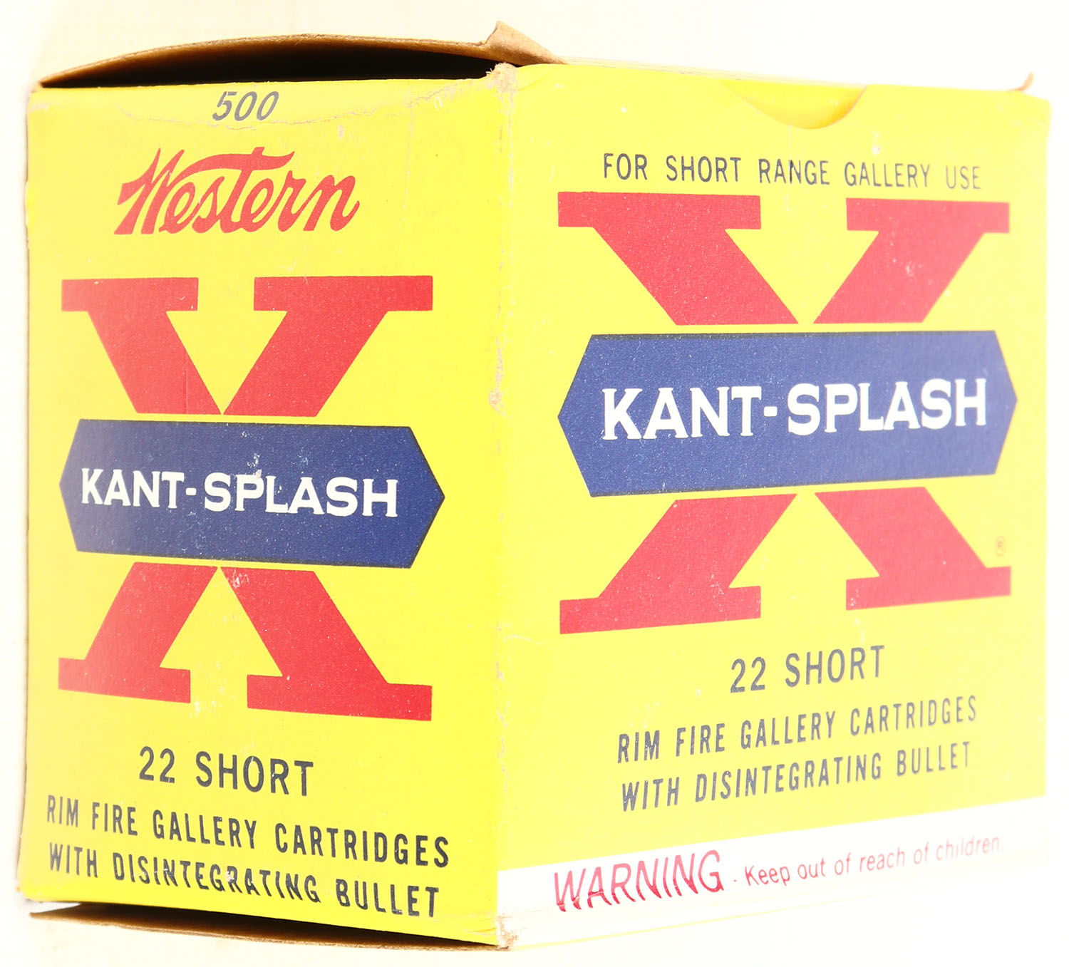 Western, Kant-Splash, .22 Short, Gallery Cartridges, Full, 500rds. 1pc. Yellow red & blue bulk box, box is solid with minty color, minor corner wear, edges are crisp, box appears to have had some weight set on it as it is bulging slightly on ends, top flap is solid, ammo is excellent. Grade: Excellent - Value: 50 to 200