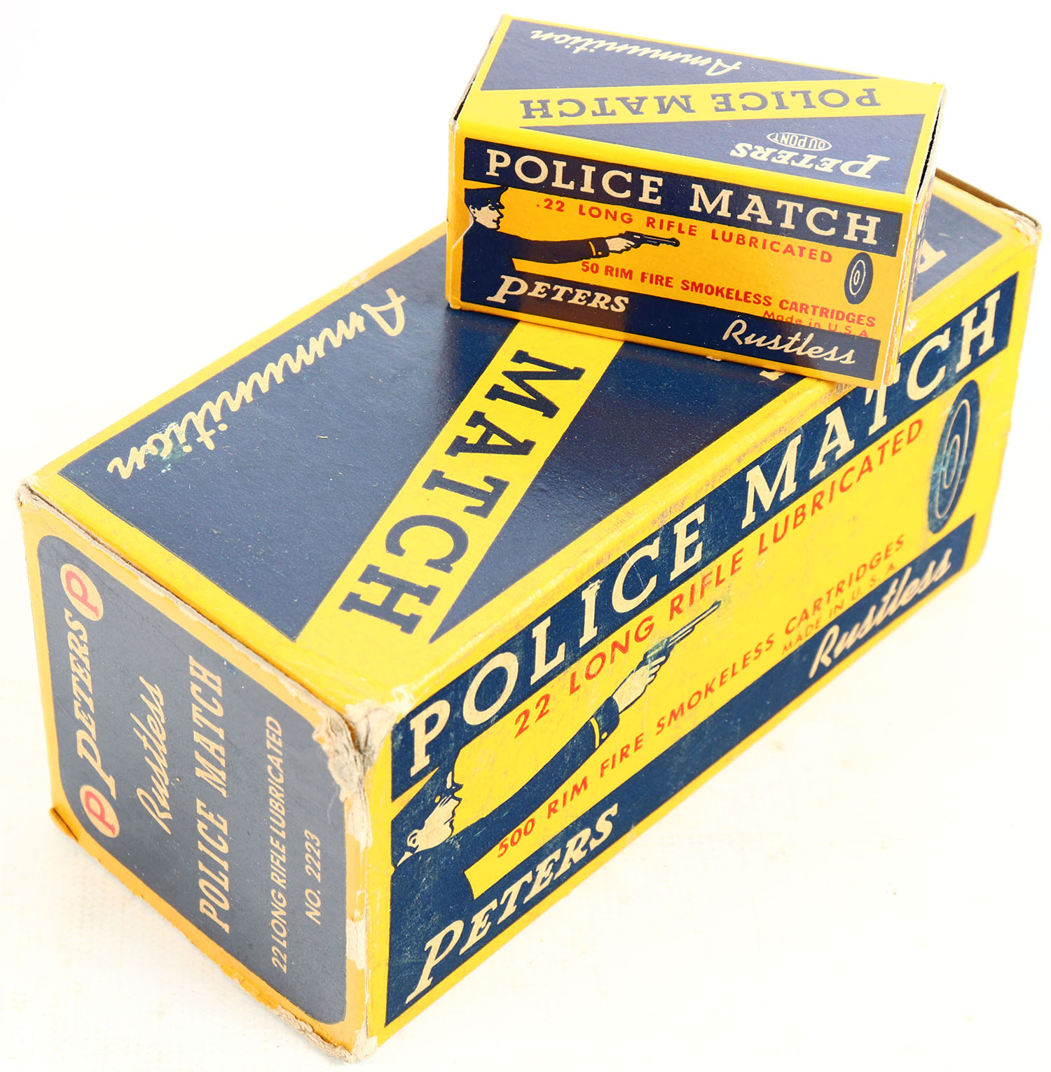 Peters, Police Match, .22 Long Rifle, Full, 500rds. 1pc. Yellow blue & white brick, brick is solid with very good color, some age soiling & shelf wear, corner wear, edges are mostly crisp, end flaps are solid, inside boxes are mint. Grade: Very Good + - Value: 200 to 800