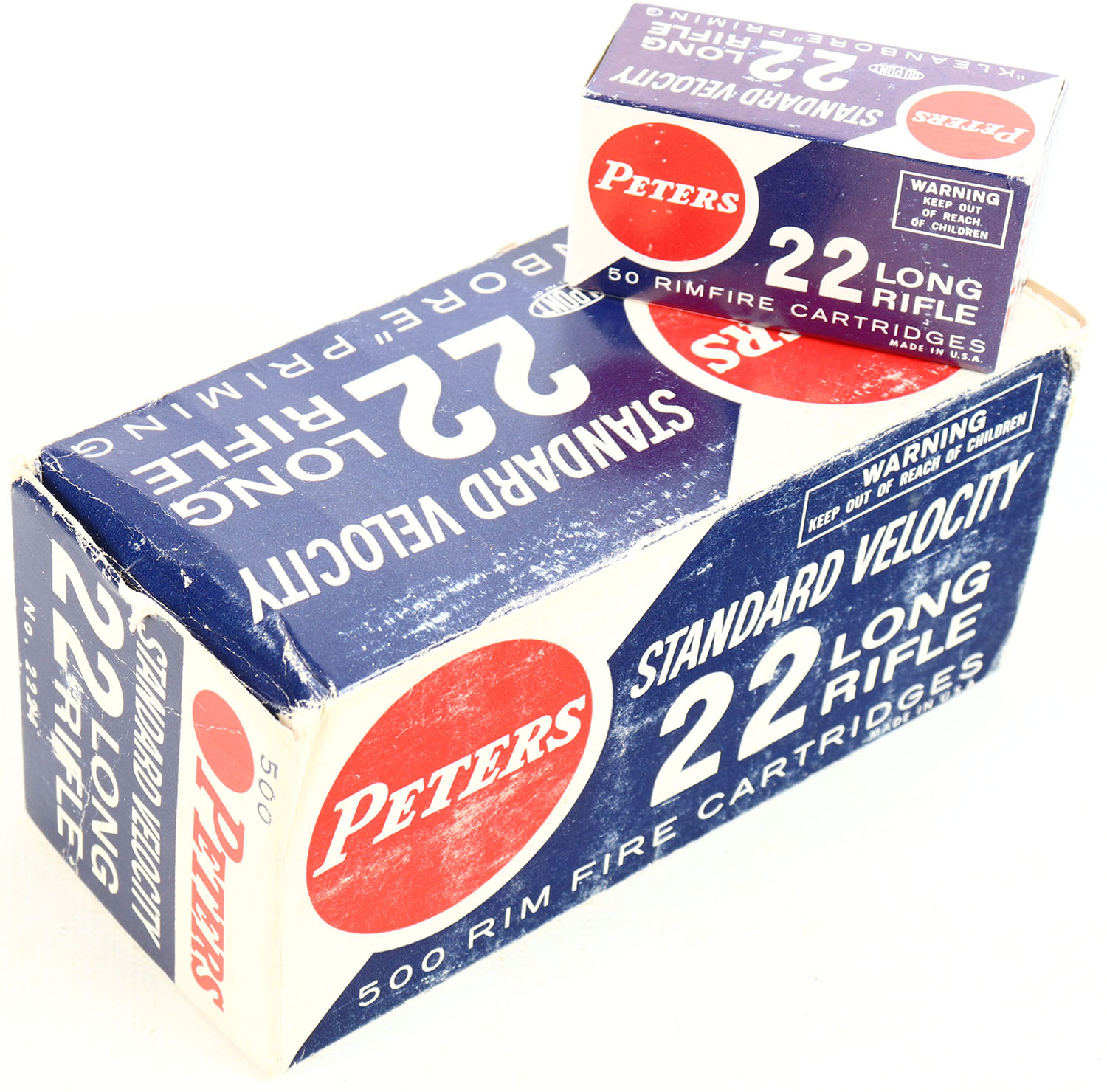 Peters, Standard Velocity, .22 Long Rifle, Full, 500rds. 1pc. Blue white & red brick, brick is solid with very good to excellent color, very minor age soiling, shelf wear, edge & corner wear, end flaps are solid, inside boxes are minty. Grade: Very Good - Value: 40 to 120
