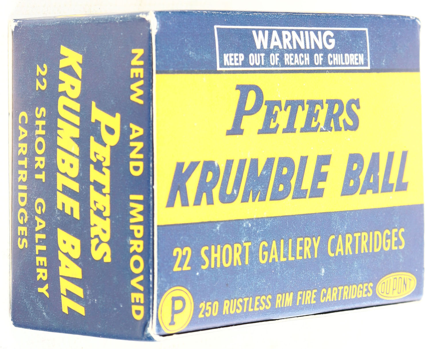 Peters, Krumble Ball, .22 Short, Gallery Cartridges, Full, 250rds. 1pc. Blue & yellow bulk box, box is near mint with excellent to minty color, only has minor shelf wear, corners are mostly sharp, edges are crisp, top flap is solid, ammo is excellent. Grade: Excellent ++ - Value: 100 to 300