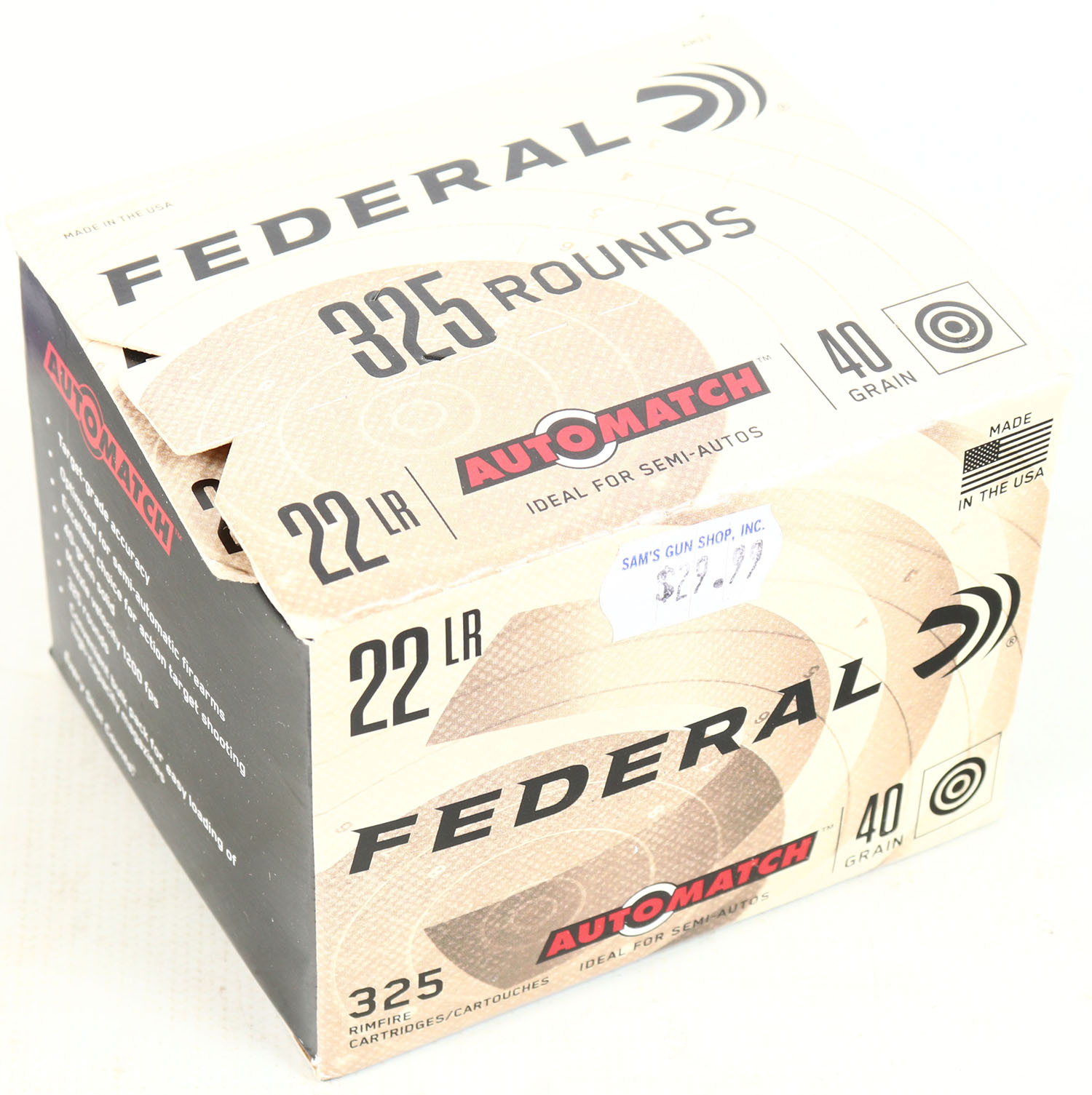 Federal, AutoMatch, .22 Long Rifle, Ideal for Semi-Autos, 40 Grain Solid, 1200 FPS, FULL & SEALED 325 rds. 1pc. Tan & black bulk box, box is solid with minty color, very minor corner wear, edges are crisp. Grade: Excellent ++ - Value: 10 to 50