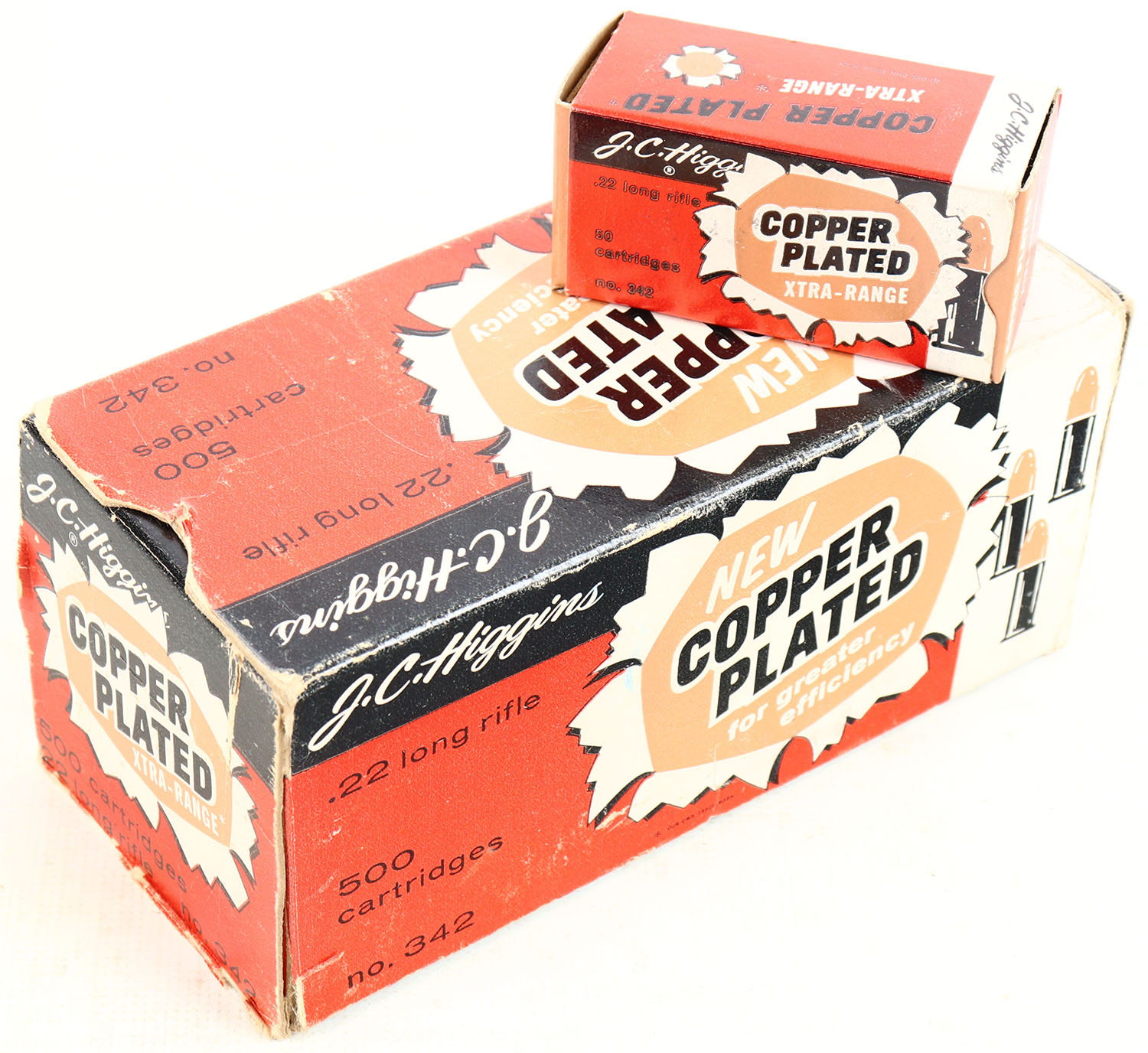 Sears, J.C. Higgins, .22 Long Rifle, Copper Plated Xtra-Range, Partial 9 boxes, 1pc. Red white & black brick, right end flap is torn, excellent color, some shelf & corner wear, minor edge wear, left end flap is solid, inside boxes are excellent. Grade: Very Good - Value: 20 to 60