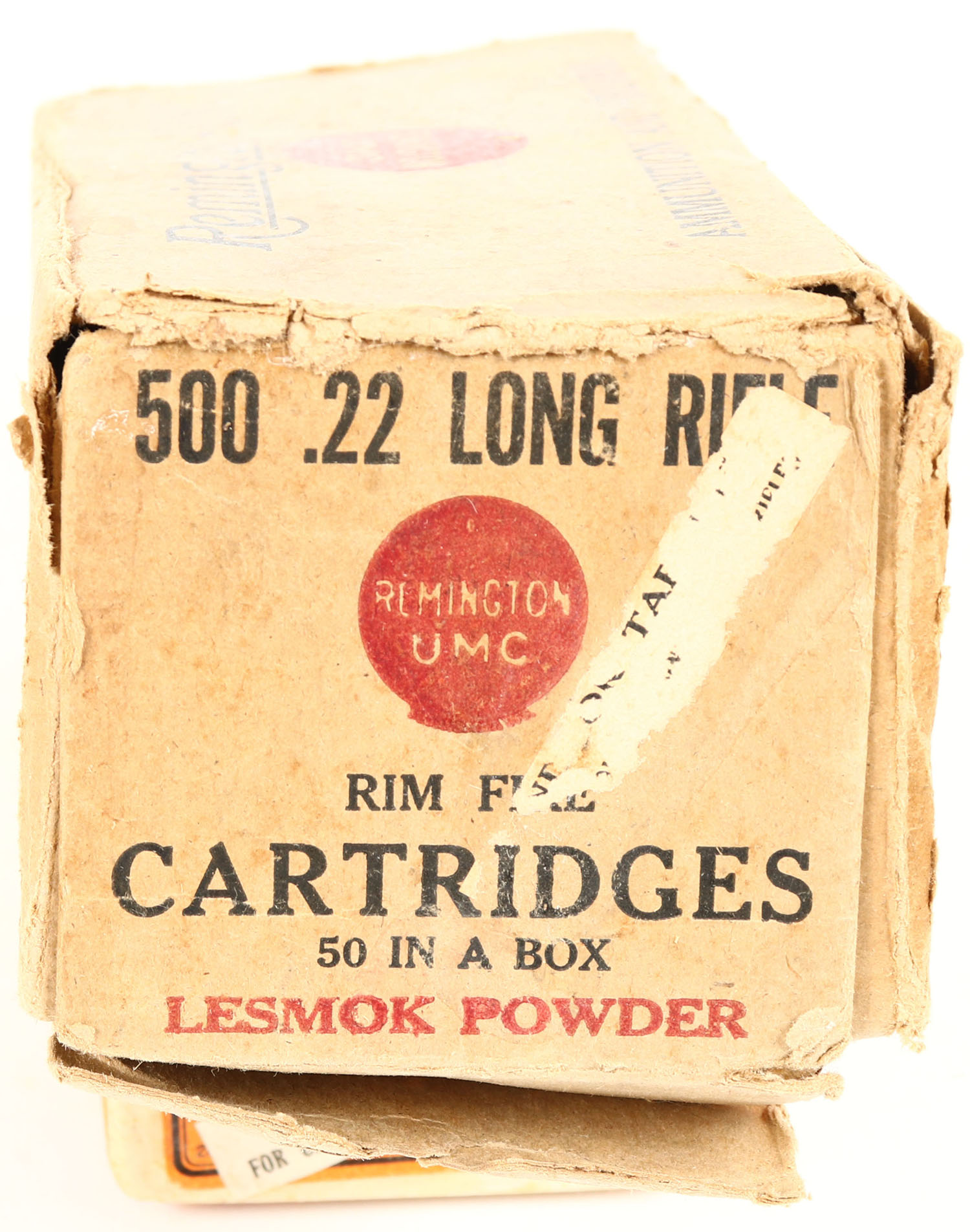 RARE! REM-UMC, ''Indoor Target'', .22 Long Rifle, R.F. Lesmok, Full, 500rds. 1pc. Buff black & red brick, brick is solid with very good color, ''Indoor Target'' over-label on left end as well as on all inside boxes, Remington-UMC label printed upside down, some age soiling, very minor staining, tear on bottom, partial seam split to right end flap, factory seam has unadhered, edge & corner wear, over-label on end flap is 25% intact, inside boxes are excellent to minty. Grade: Good ++ - Value: 500 to 2500