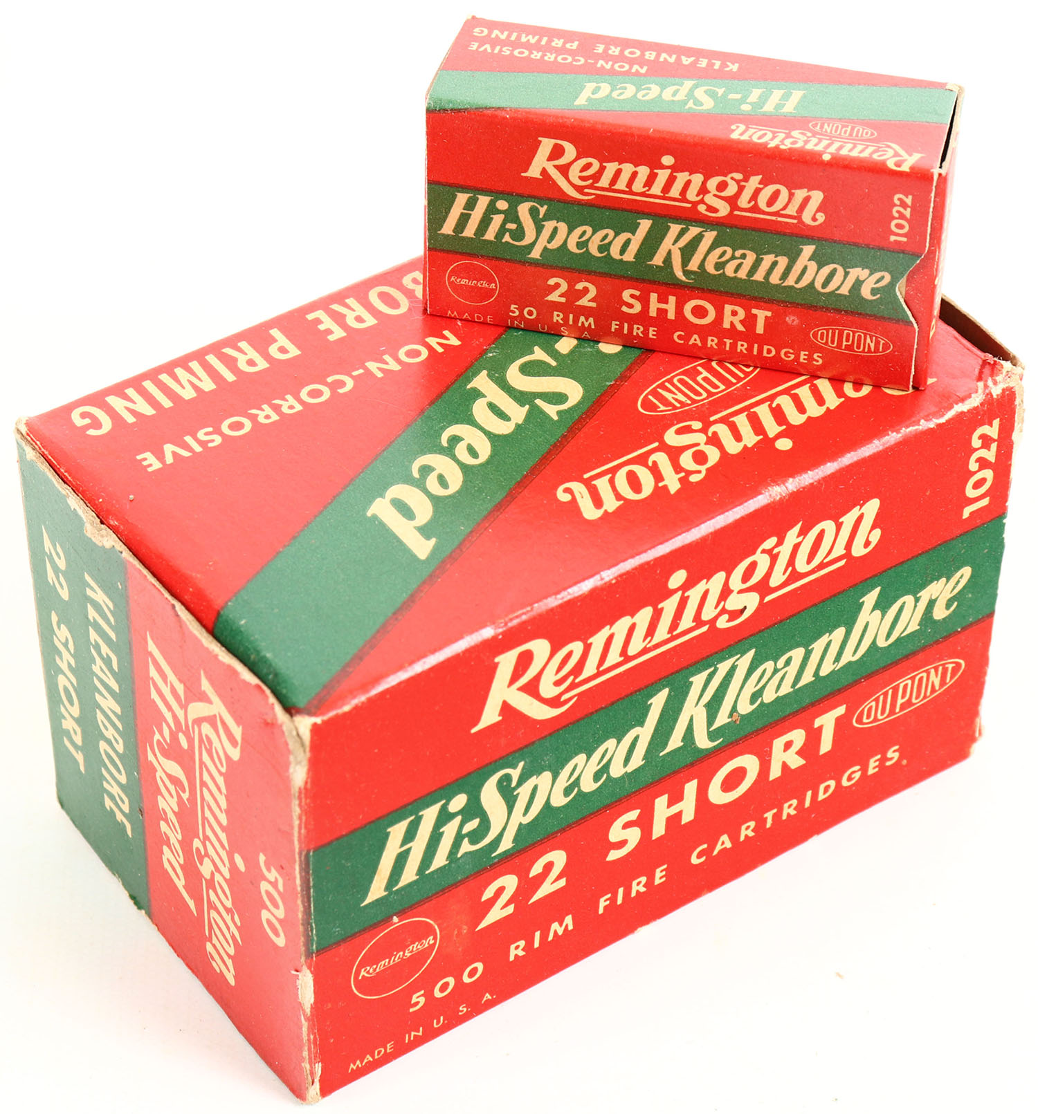 Remington, Hi-Speed Kleanbore, .22 Short, Full, 500rds. 1pc. Red green & white brick, brick is solid with excellent color, minor age soiling, some corner wear, very minor edge wear, end flaps are solid, inside boxes are excellent to minty. Grade: Excellent - Value: 60 to 180