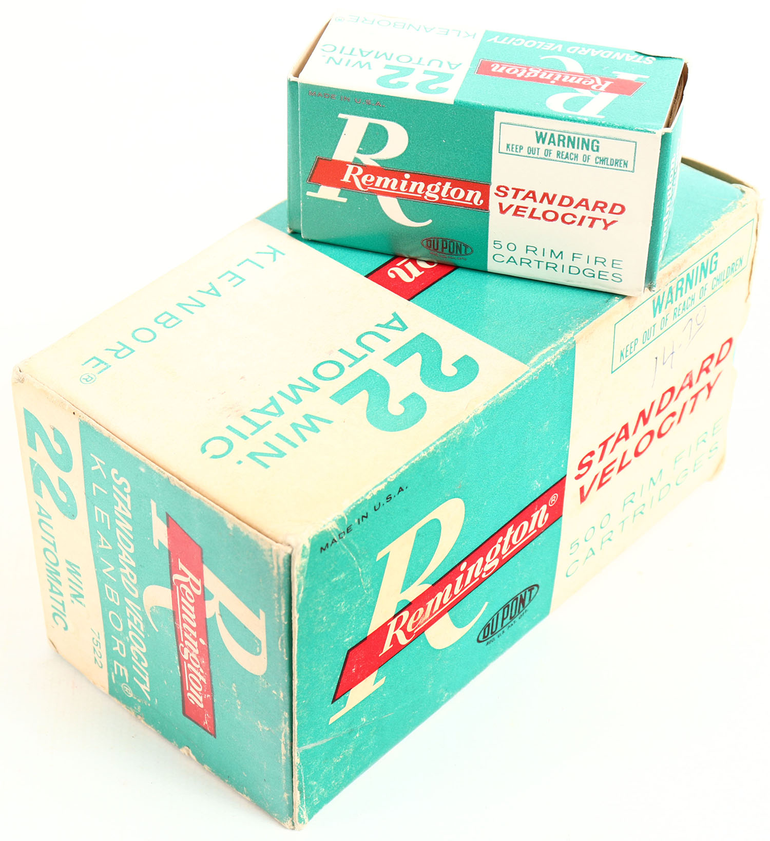 Remington, Standard Velocity, .22 Winchester Automatic, Full, 500rds., 1pc. Green white & red brick, brick is solid with very good color, some age soiling, top & right end have been written on, some edge & corner wear, end flaps are solid, inside boxes are excellent to minty. Grade: Very Good + - Value: 100 to 300
