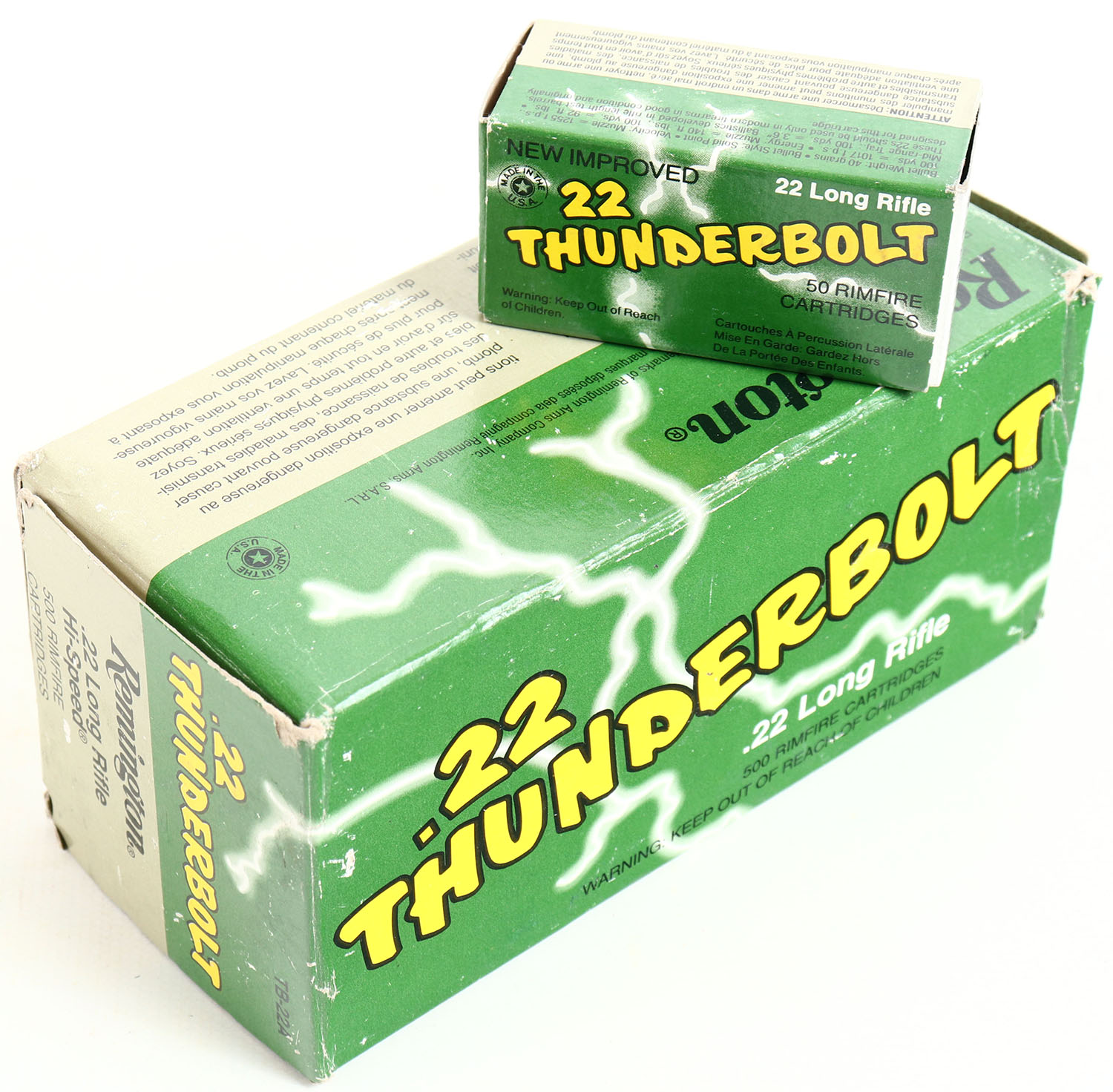 Remington, .22 Thunderbolt, .22 Long Rifle, Full 500rds., 1pc. Green gray & yellow brick, brick is solid with excellent to minty color, some shelf & corner wear, very minor edge wear, end flaps are solid, inside boxes are minty. Grade: Excellent - Value: 20 to 60