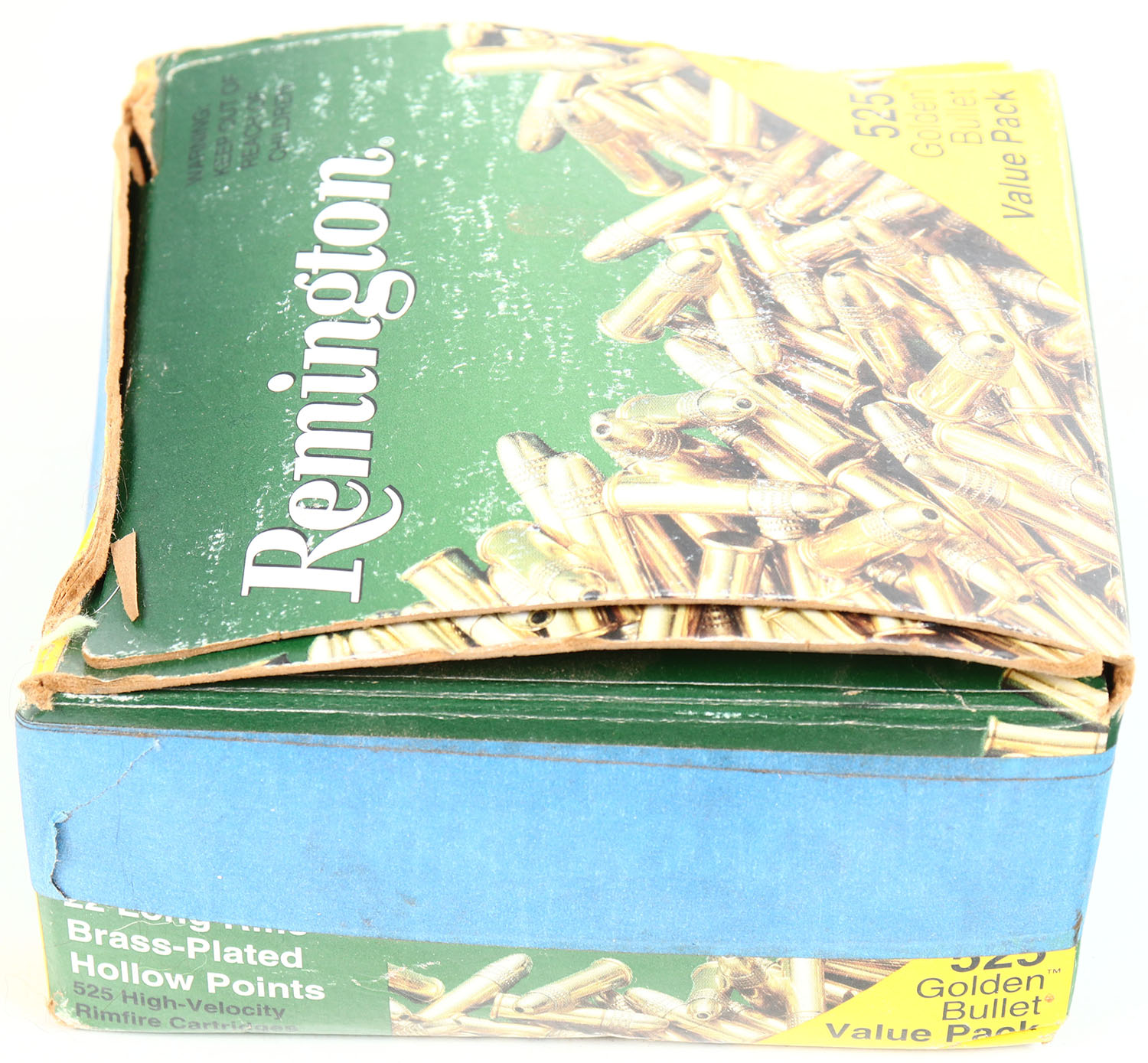 Remington, Golden Bullet Value Pack, .22 Long Rifle Hollow Point, Appears partial - about 3/4 full, 1pc. Multi-colored box, box is wrapped in painters tape, corner wear, some edge wear, top flap is solid, ammo is excellent. Grade: Very Good + - Value: 8 to 40