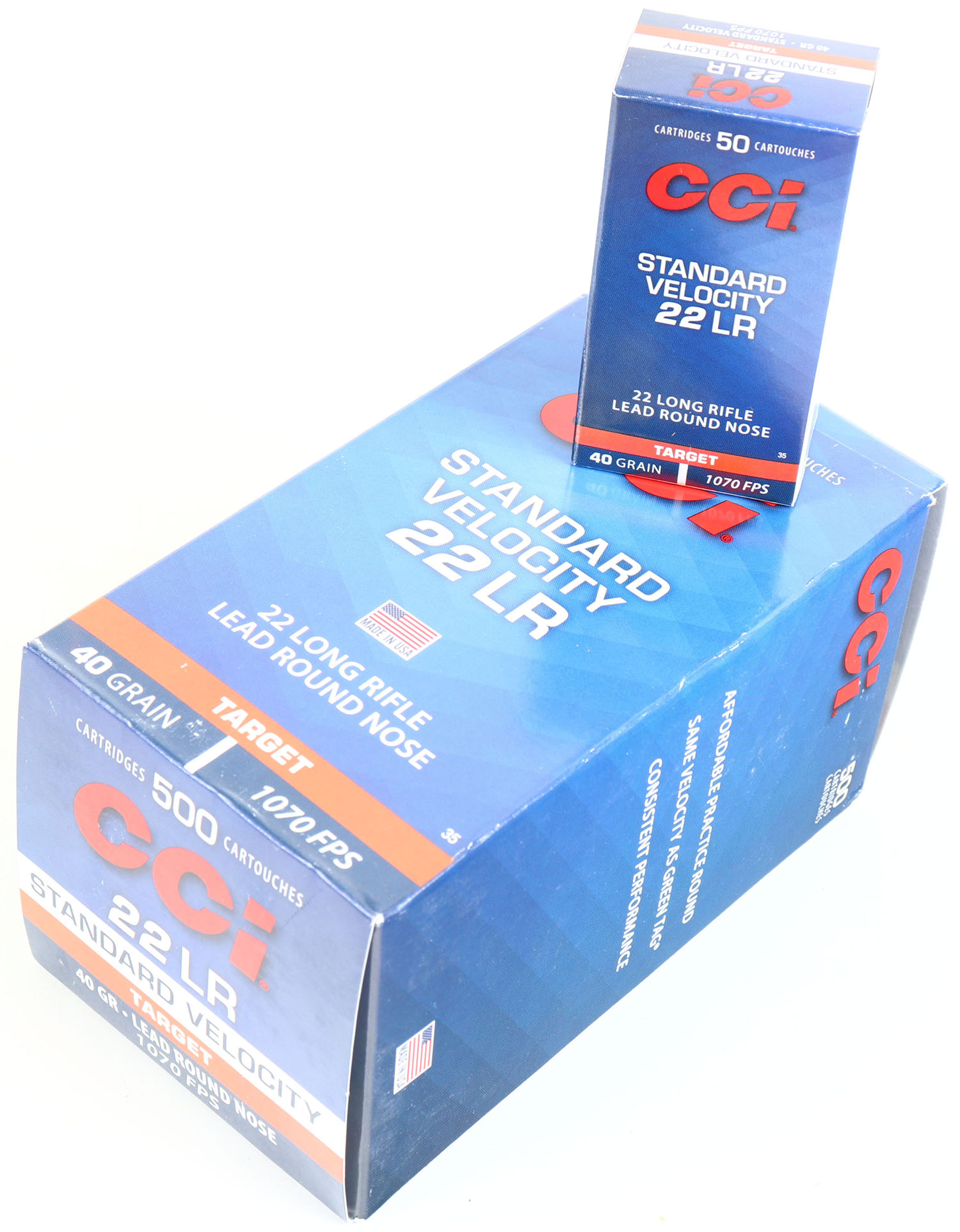 CCi, Standard Velocity, .22 Long Rifle, 40 Grain Lead Round Nose, 1070 FPS, Full 500rds., 1pc. Blue red & white brick, brick is MINT with mint color, corners are sharp, edges are crisp, end flaps are solid, inside boxes are mint. Grade: MINT - Value: 20 to 60