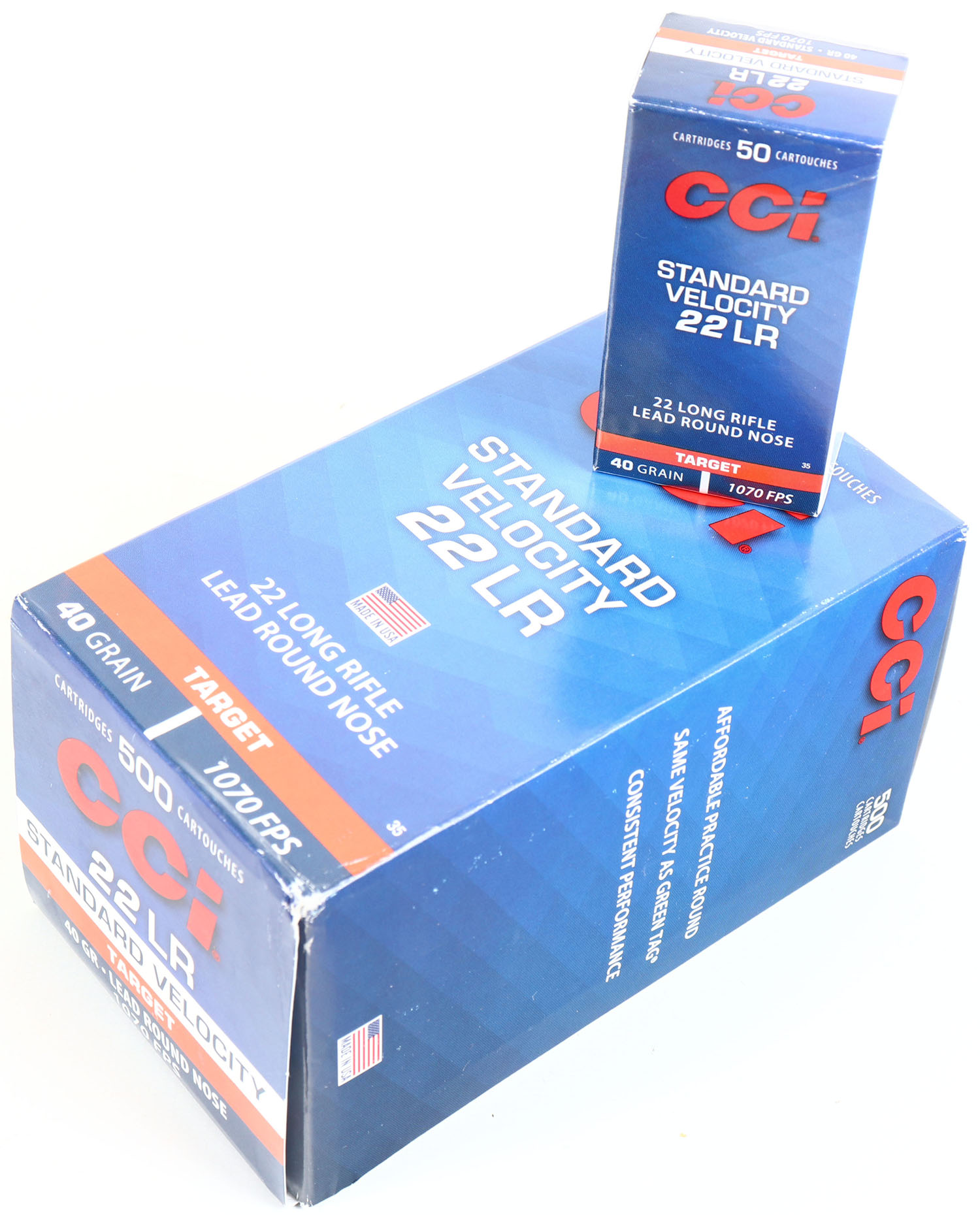CCi, Standard Velocity, .22 Long Rifle, 40 Grain Lead Round Nose, 1070 FPS, Full 500rds., 1pc. Blue red & white brick, brick is near mint with minty color, only very minor corner wear, edges are crisp, end flaps are solid, inside boxes are mint. Grade: Excellent ++ - Value: 20 to 60
