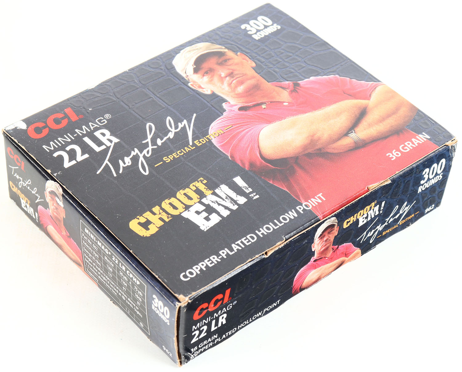 CCi, Mini-Mag, .22 LR Copper Plated Hollow Point, Troy Landry Special Edition, Full, 300rds. bulk box, box is near mint with minty color, only very minor corner wear, edges are crisp, top flap is solid, ammo is mint. Grade: Excellent ++ - Value: 20 to 40