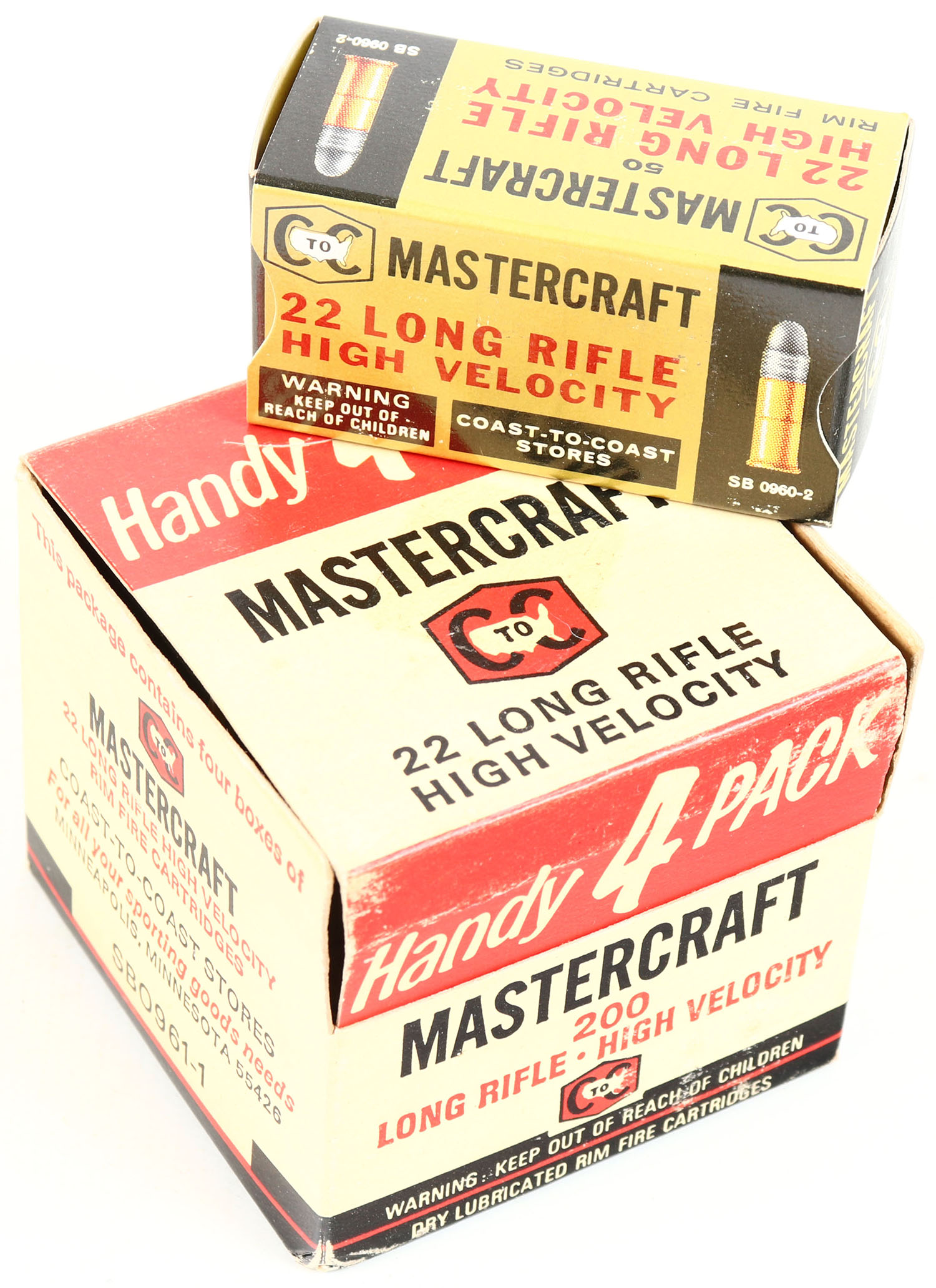 Coast to Coast, Handy 4 Pack, Mastercraft, .22 Long Rifle, Full, 200rds. 1pc. White red & black brick, brick is solid with very good to excellent color, minor age soiling & shelf wear, minor corner wear, edges are crisp, top flap is solid, inside boxes are minty. Grade: Excellent + - Value: 20 to 80