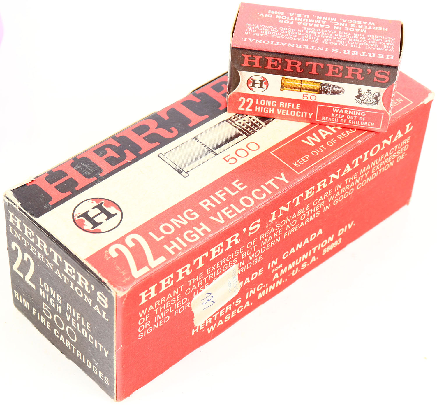 Herters, .22 Long Rifle, High Velocity, Full, 500rds. 1pc. Red black & white brick, brick is solid with very good to excellent color, minor age soiling & corner wear, edges are crisp, top flap is solid, inside boxes are excellent to minty. Grade: Excellent + - Value: 50 to 150