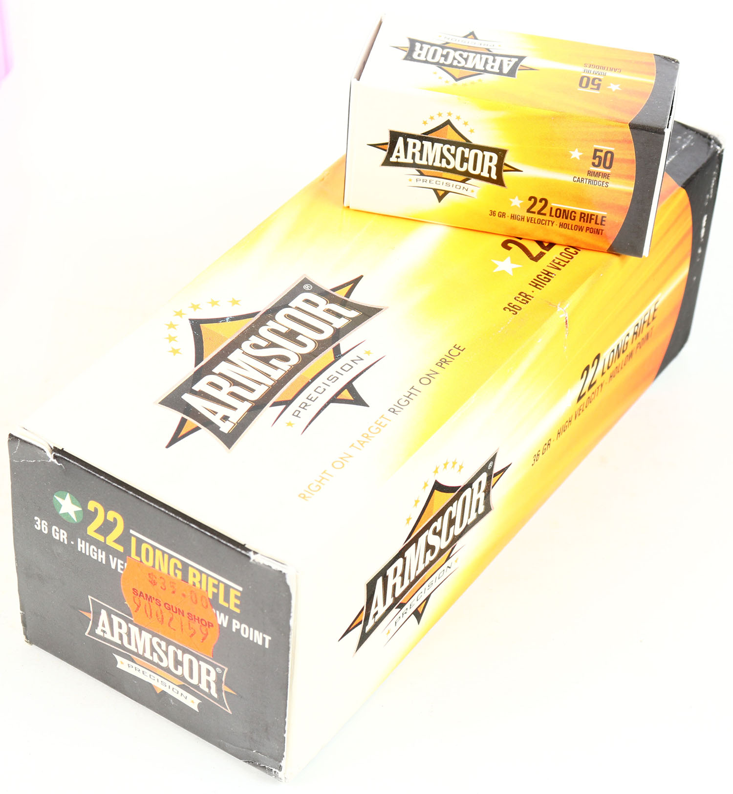 Armscor, Precision, .22 Long Rifle Lead Round Nose, 40 Grain, Full 500rds., 1pc. White orange & black brick, brick is solid with minty color, some corner wear, edges are crisp, end flaps are solid, inside boxes are mint. Grade: Excellent ++ - Value: 30 to 90