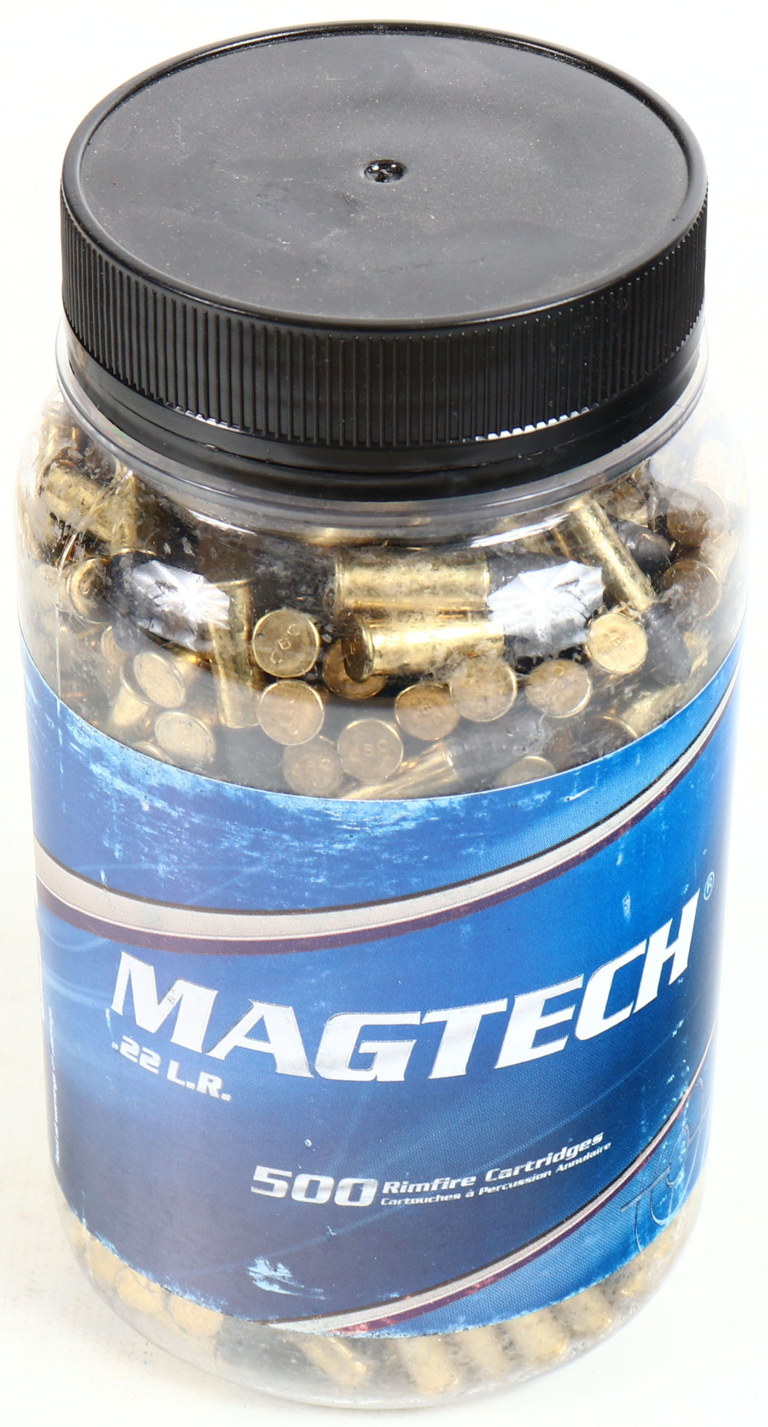 MagTech, .22 Long Rifle, 40 Grain Lead Round Nose, Standard Velocity, FULL & SEALED, 2pc. Clear plastic jar, jar is solid, slightly cloudy from lead lubrication, label is has excellent color with minor shelf wear, ammo appears minty. Grade: Excellent ++ - Value: 20 to 60
