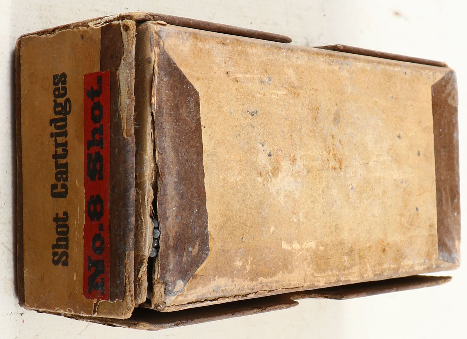 American Metallic Cartridge Company, Solid Head Cartridges, 45-100 Central Fire, .45 caliber shot cartridges, Partial 38rds., 2pc. Buff box with white & gray label, box is solid with very good color, some age soiling, vertical seam splits to both front corners of lid, vertical seam split to front right corner of bottom, some edge & corner wear, labels are 99% intact, ammo is fair. Grade: Good ++ - Value: 70 to 280