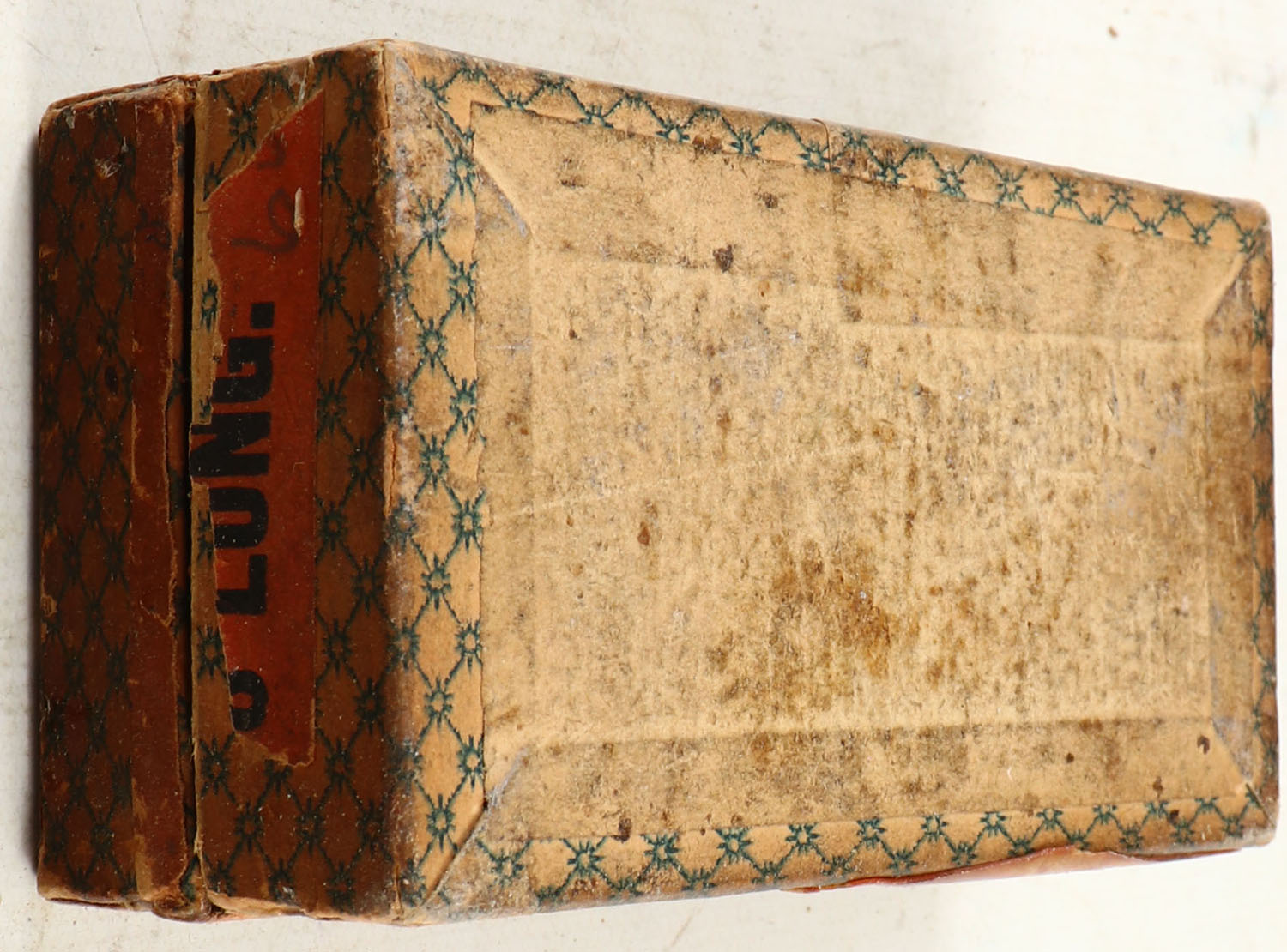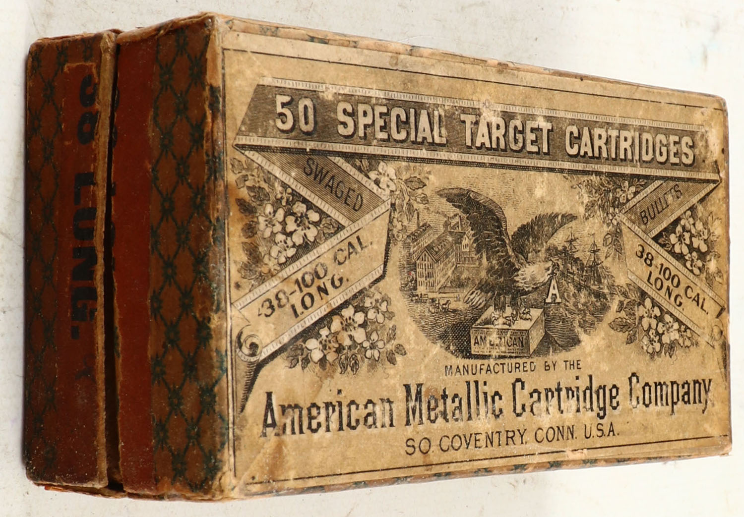 American Metallic Cartridge Company, Special Target Cartridges, 38-100 Cal. Long, Full, 2pc. Blue & white fabric box with white top label & orange side sealing label, box is solid with good color, age soiling, some shelf & corner wear, very minor edge wear, side sealing label is 40% intact, ammo is good. Grade: Very Good - Value: 60 to 240