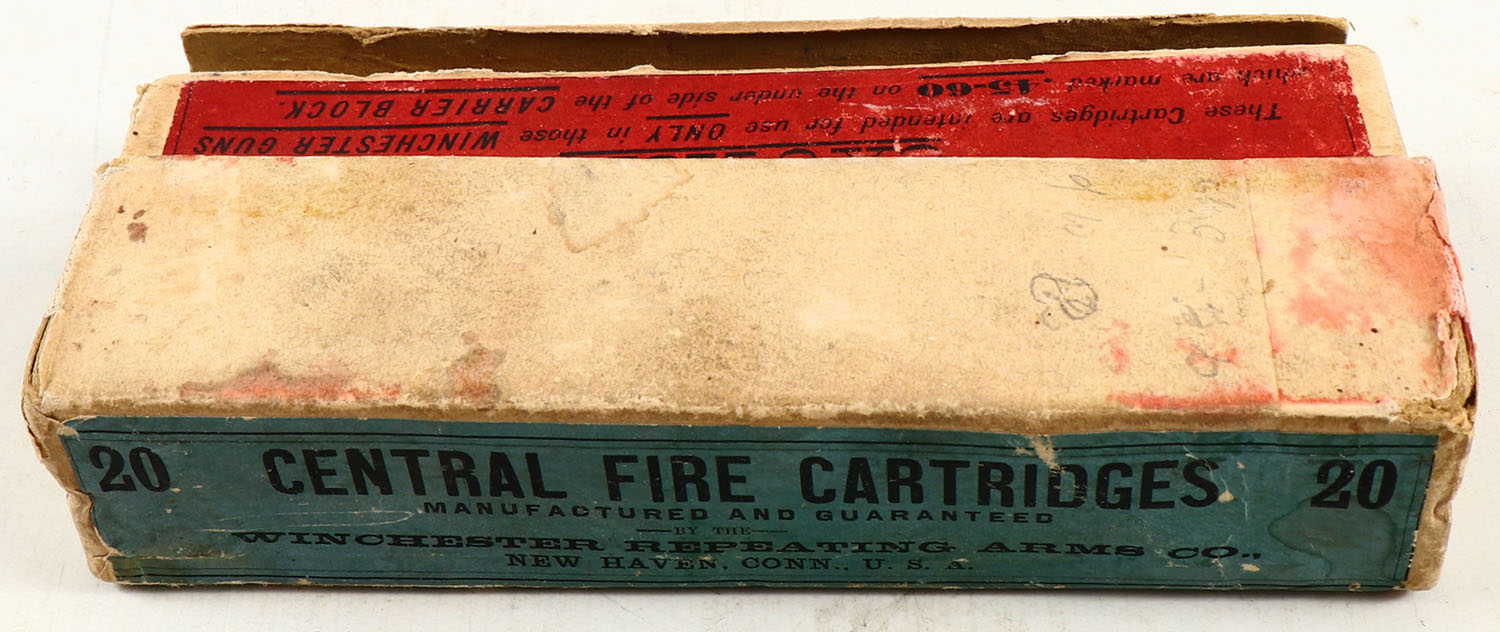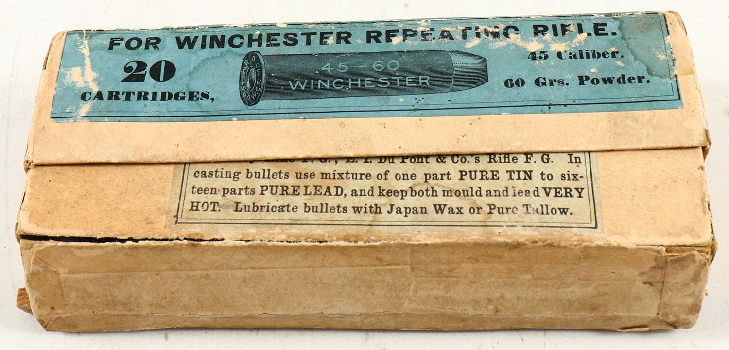 Winchester, Central Fire Cartridges, .45-60 Winchester, Full of mixed H/S, 2pc. Buff box with blue label, bottom is 3/4 torn, very good color, some water spots & shelf wear, some corner wear, minor edge wear, label is intact, ammo is excellent. Grade: Good - Value: 100 to 400