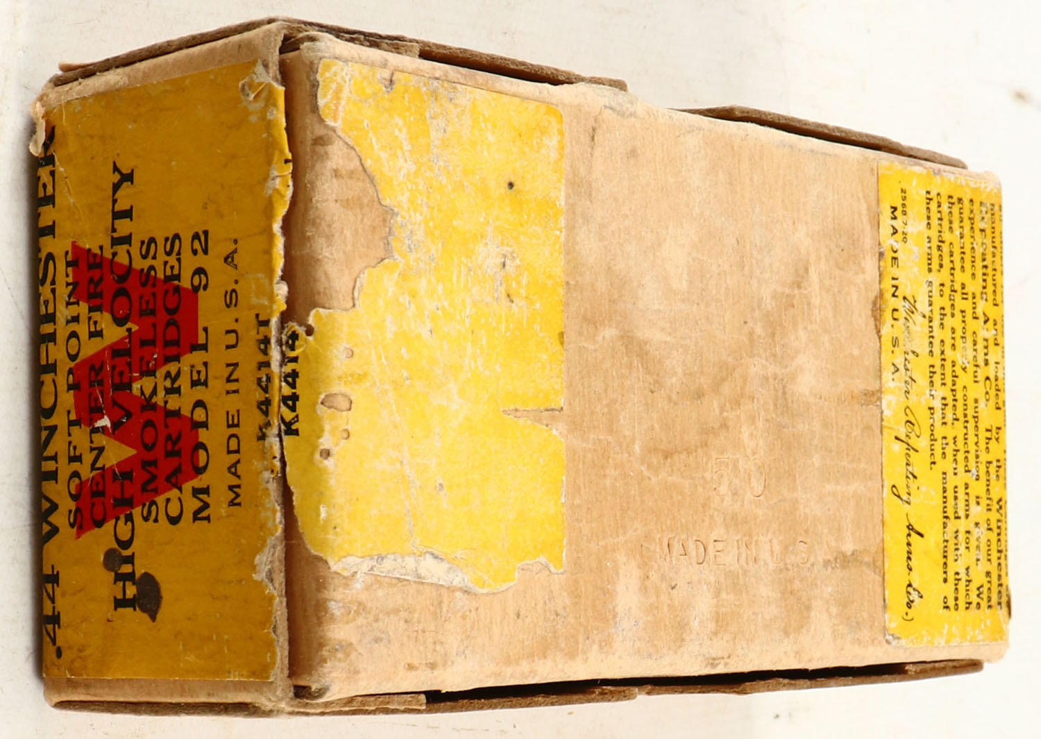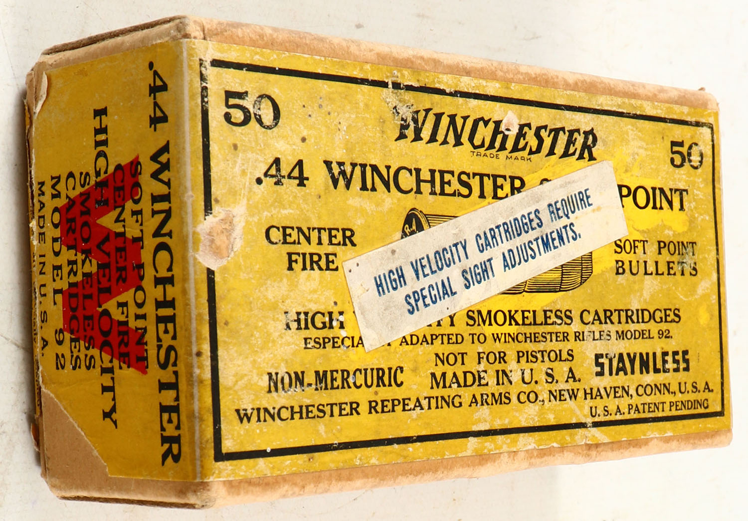 Winchester, Staynless, .44 Winchester, Smokeless, Full, 2pc. Buff box with yellow wraparound label, white High Velocity over-label, box is solid with very good color, some age soiling, shelf wear, very minor edge & corner wear, labels are intact, ammo is excellent. Grade: Very Good ++ - Value: 600 to 1200