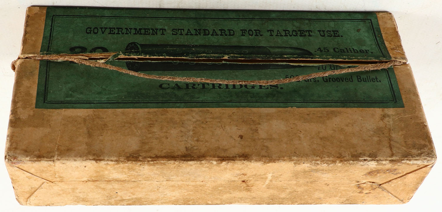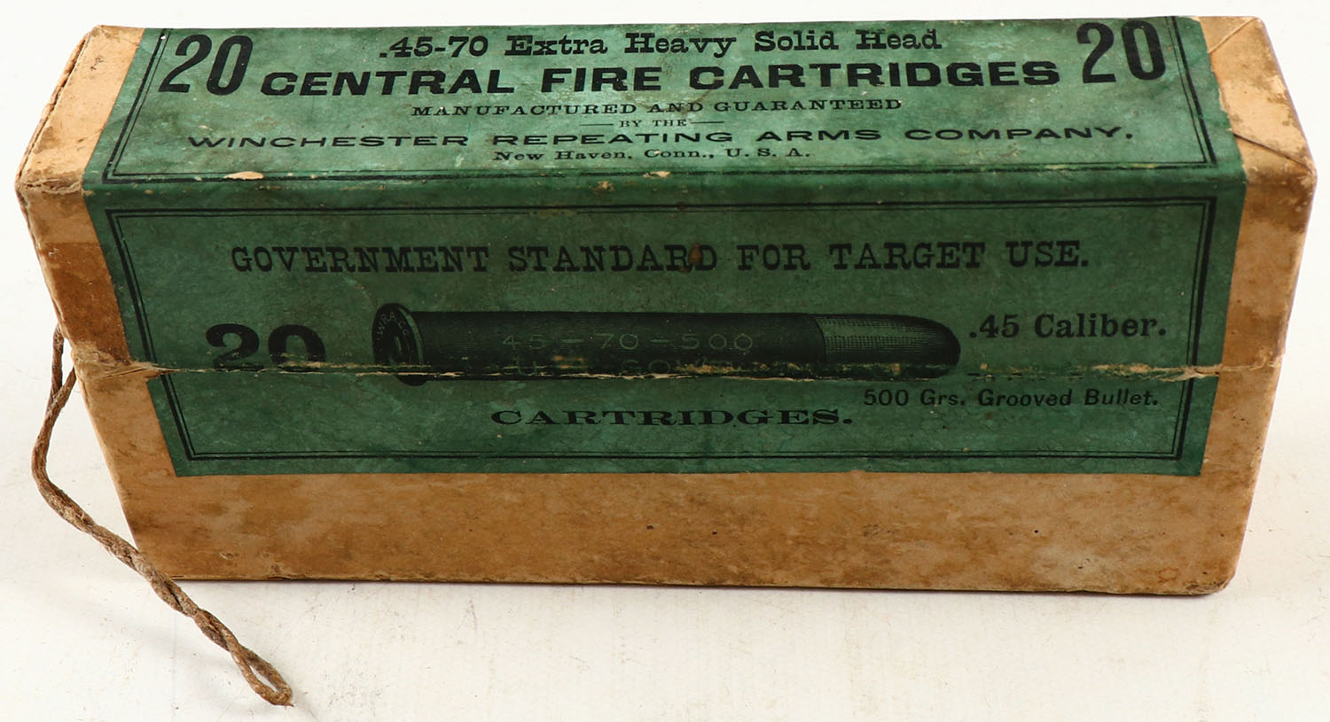 Winchester, Central Fire Cartridges, .45-70, Extra Heavy Solid Head, 500 Grs. Grooved Bullet, Full, 2pc. Buff box with green label, box is solid with very good color, some age soiling, minor edge & corner wear, pull string is intact, label is intact, ammo is excellent. Grade: Very Good ++ - Value: 100 to 300