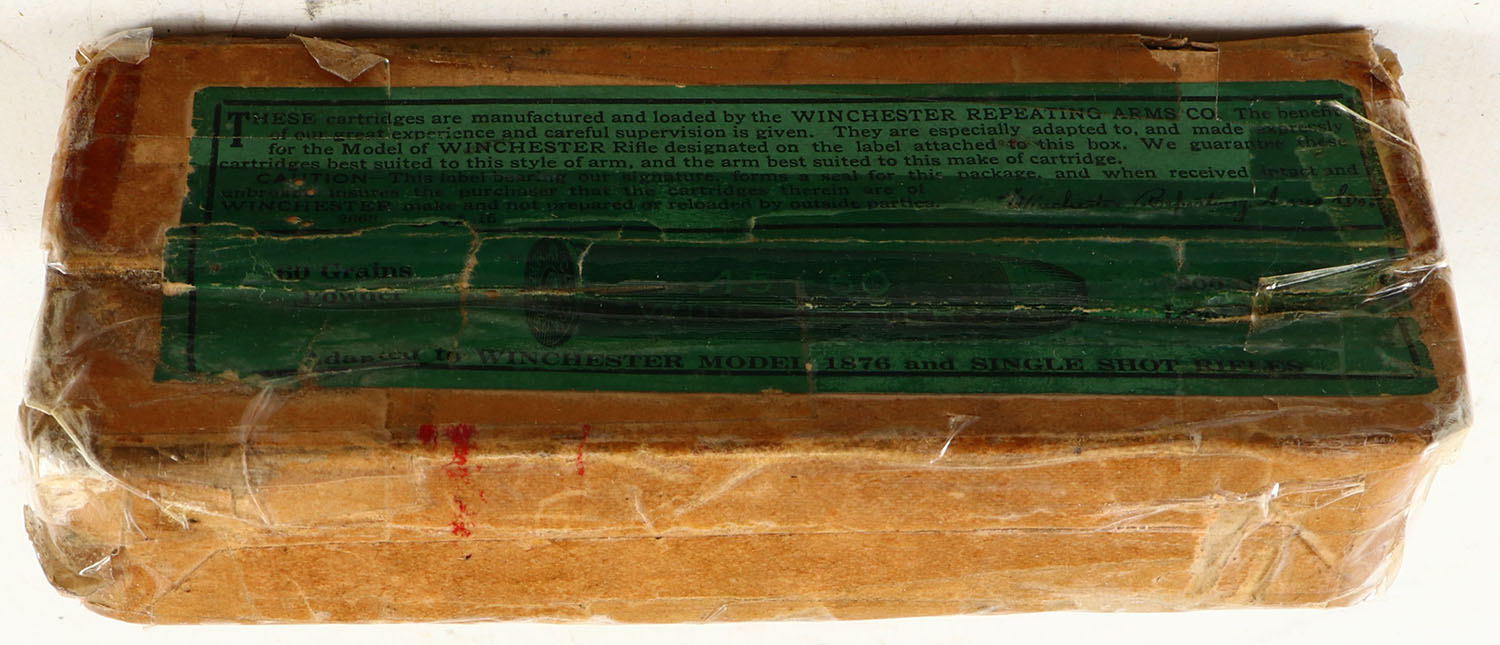 Winchester, .45-60, 300 Grain Bullet, Full, 2pc. Buff box with green labels, box is covered in tape, top is hinged by seam splits, very good color, some age soiling, edge & corner wear, labels are intact, ammo is excellent. Grade: Fair ++ - Value: 40 to 120
