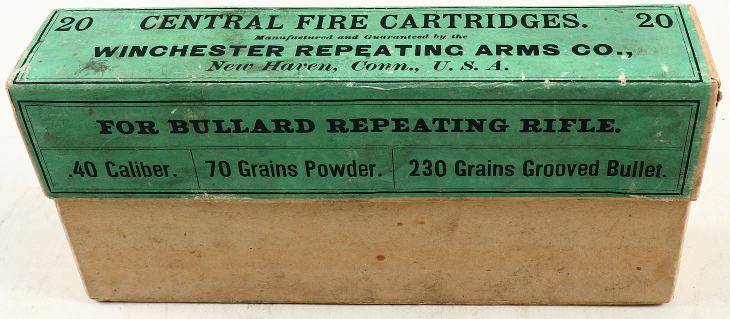 Winchester, Central Fire Cartridges, .40-70 Bullard, For Bullard Repeating Rifle, 230 Grains Grooved Bullet, Full, 2pc. Buff box with green label, box is solid with excellent color, minor age soiling & shelf wear, very minor edge & corner wear, label is intact, ammo is excellent. Grade: Excellent - Value: 500 to 1500