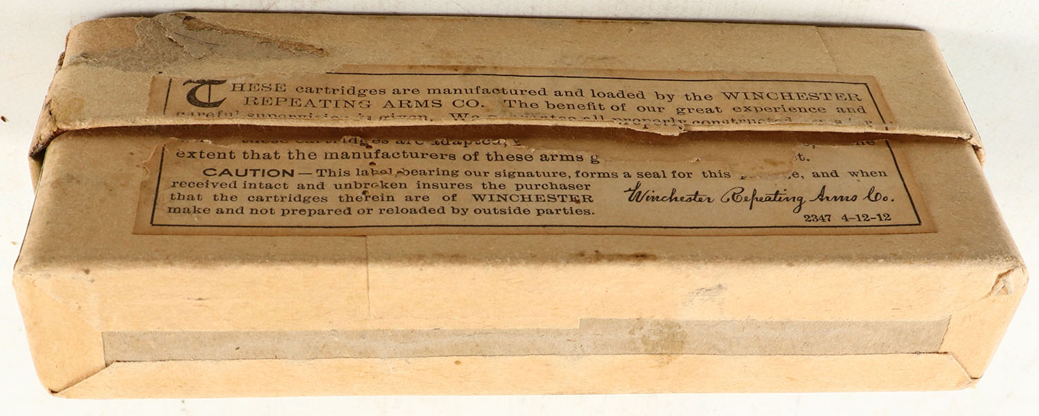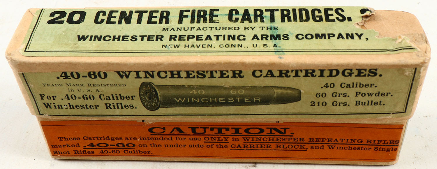 Winchester, Center Fire Cartridges, .40-60 Winchester, 210 Grs. Bullet, Full, 2pc. Buff box with green & orange labels, box is solid with excellent color, top has been torn & repaired from the inside, minor corner wear, edges are mostly crisp, labels are 99% intact, ammo is excellent. Grade: Very Good ++ - Value: 80 to 240