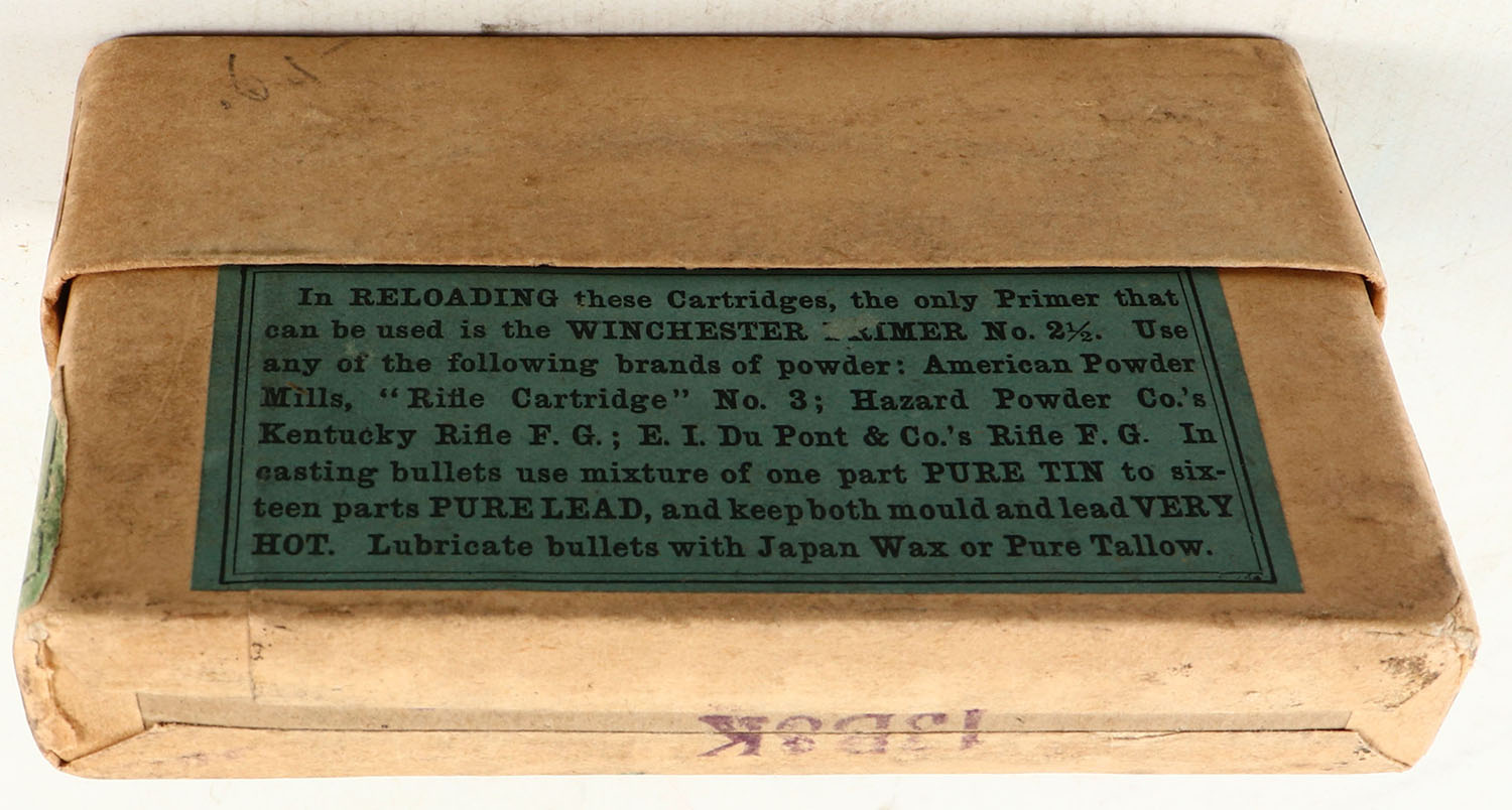 Winchester, .38-72 Winchester, 275 Grs. Bullet, Full of incorrect(?) ammo (W.R.A.Co. H/S with ''W'' brass primer), 2pc. Buff box with green labels, box is solid with very good to excellent color, some age soiling & shelf wear, minor edge & corner wear, labels are intact, ammo is excellent. Grade: Very Good ++ - Value: 50 to 150