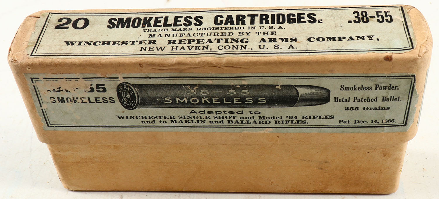 Winchester, Smokeless Cartridges, .38-55, 255 Grains Metal Patched Bullet, Full, 2pc. Buff box with green labels, box is solid with very good color, some age soiling & color fading, minor edge & corner wear, labels are 99% intact, ammo is very good. Grade: Very Good ++ - Value: 50 to 200