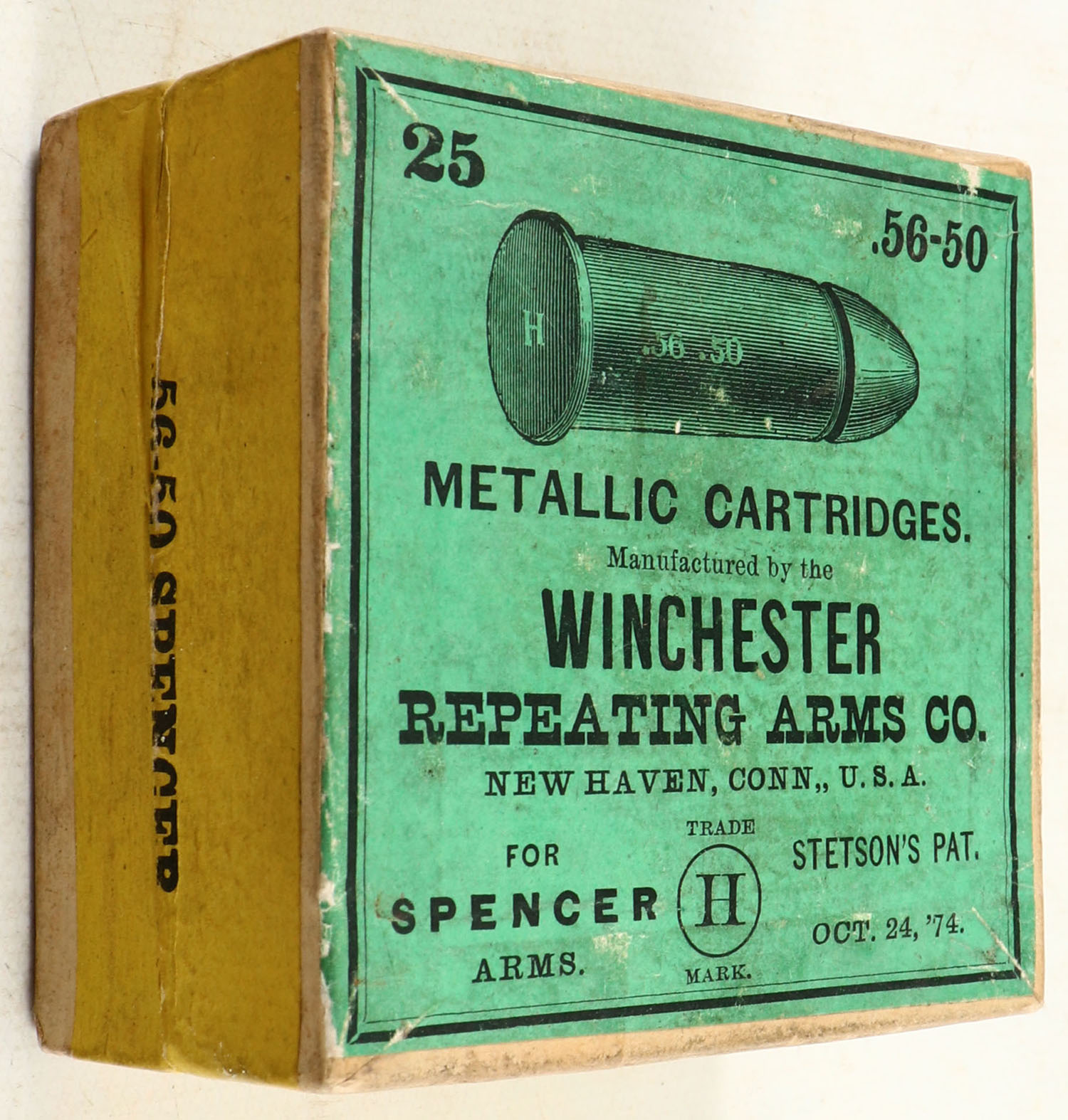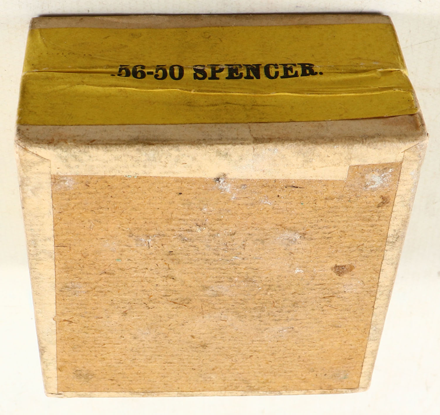 Winchester, Metallic Cartridges, .56-50 Spencer, FULL & SEALED, 2pc. Buff box with green top & yellow side sealing labels, box is solid with excellent color, minor age soiling, very minor shelf wear, corners are sharp, edges are crisp, labels are intact. Grade: Excellent ++ - Value: 500 to 1500