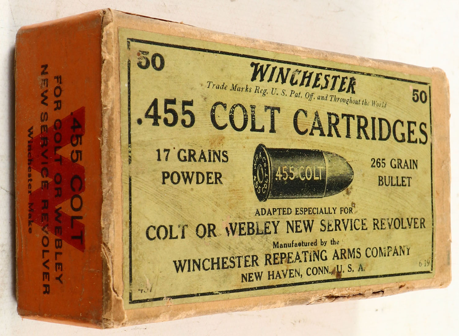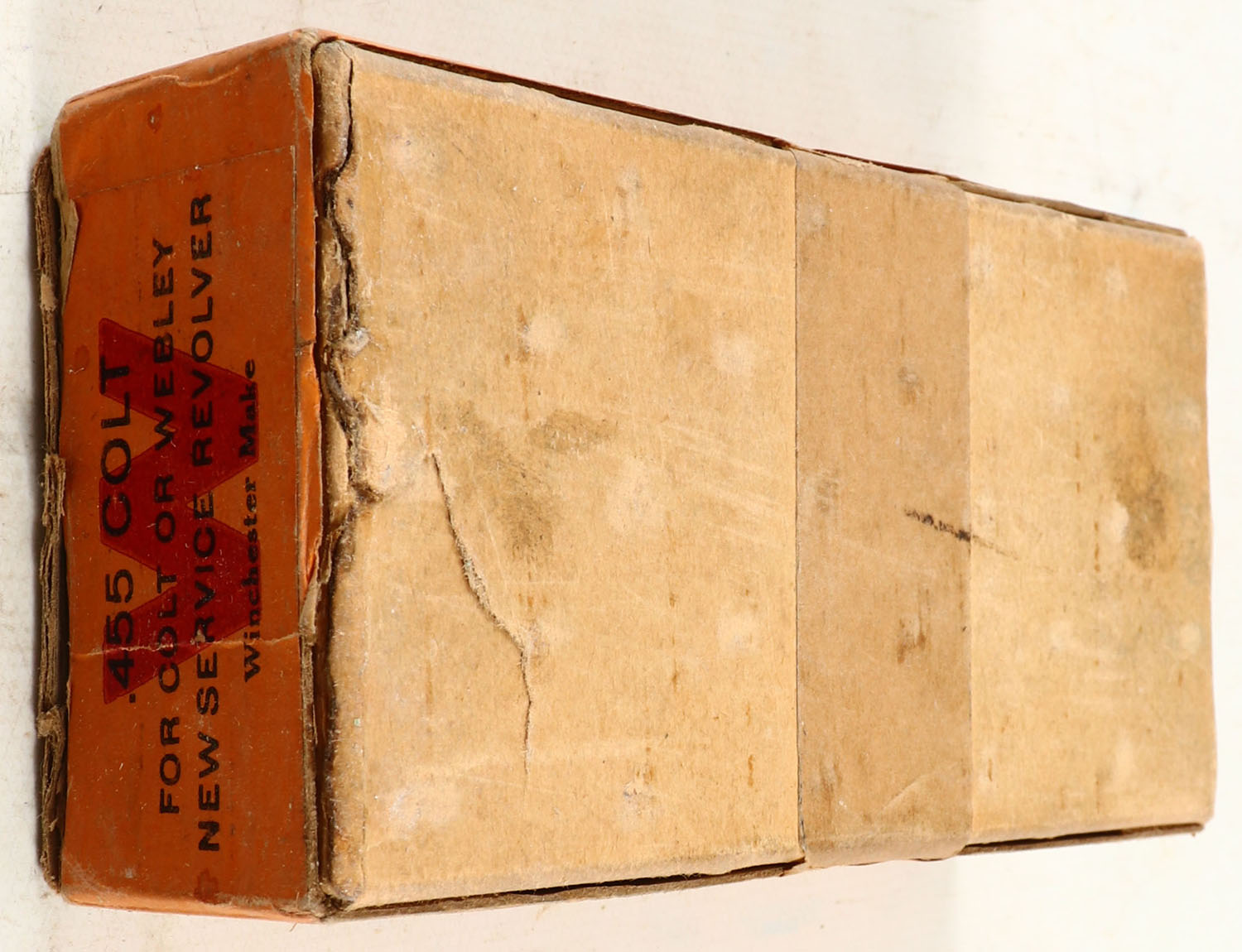 Winchester, .455 Colt, .265 Grain Bullet, For Colt or Webley New Service Revolver, FULL & SEALED, 2pc. Buff box with green top & orange side sealing labels, box is solid with very good to excellent color, some age soiling & shelf wear, some edge & corner wear, seam split to right edge of lid, labels are intact, ammo appears excellent (looking through seam split). Grade: Very Good ++ - Value: 500 to 1500