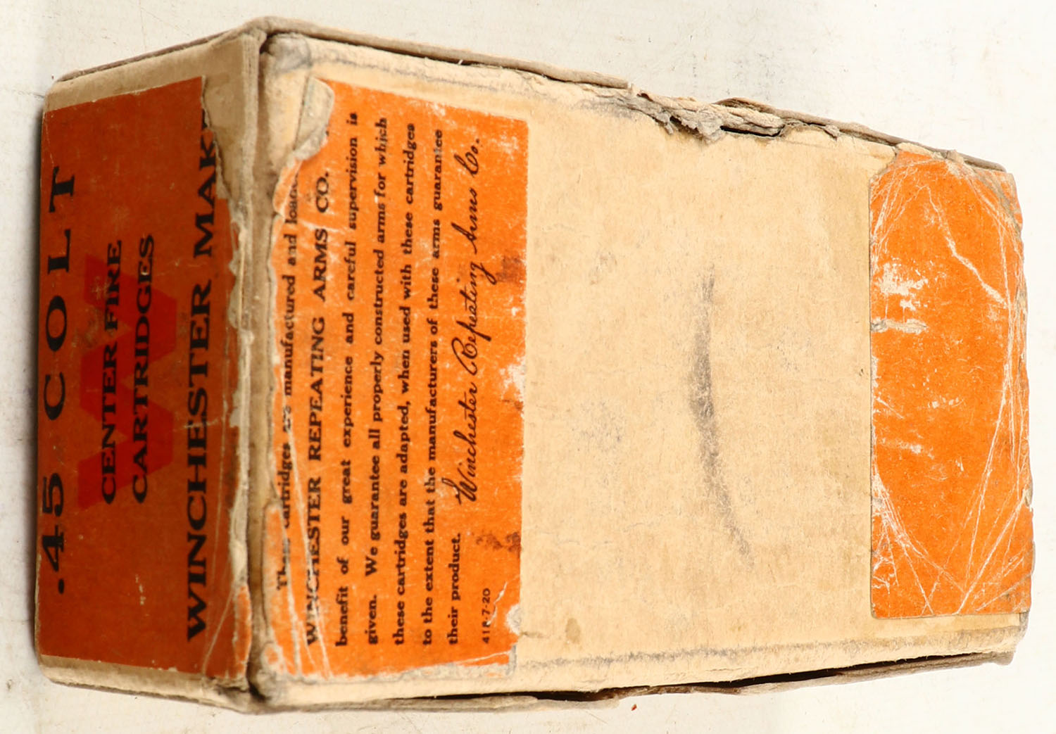 Winchester, Center Fire Cartridges, .45 Colt, 255 Grain Lead Bullets, Full of mixed primers, 2pc. Buff box with green & orange wraparound label, box is solid with excellent color, shelf wear, top & back side have been written on, minor edge & corner wear, tear to front of lid, label is intact, ammo is excellent. Grade: Very Good + - Value: 40 to 120