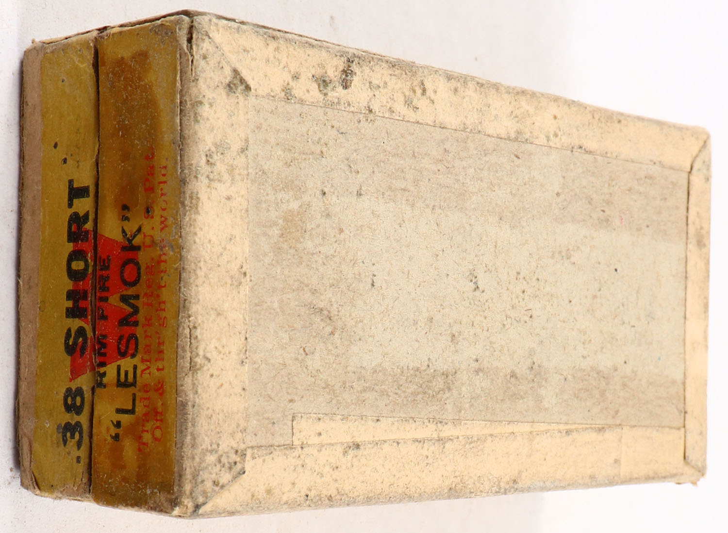 Winchester, Rifle Cartridges, .38 Short Rim Fire, ''Lesmok'', Full, 2pc. Buff box with green top & yellow side sealing labels, box is solid with good to very good color, top appears to have tape damage, minor age soiling, corner wear, some edge wear, labels are intact, ammo is very good. Grade: Good ++ - Value: 30 to 90
