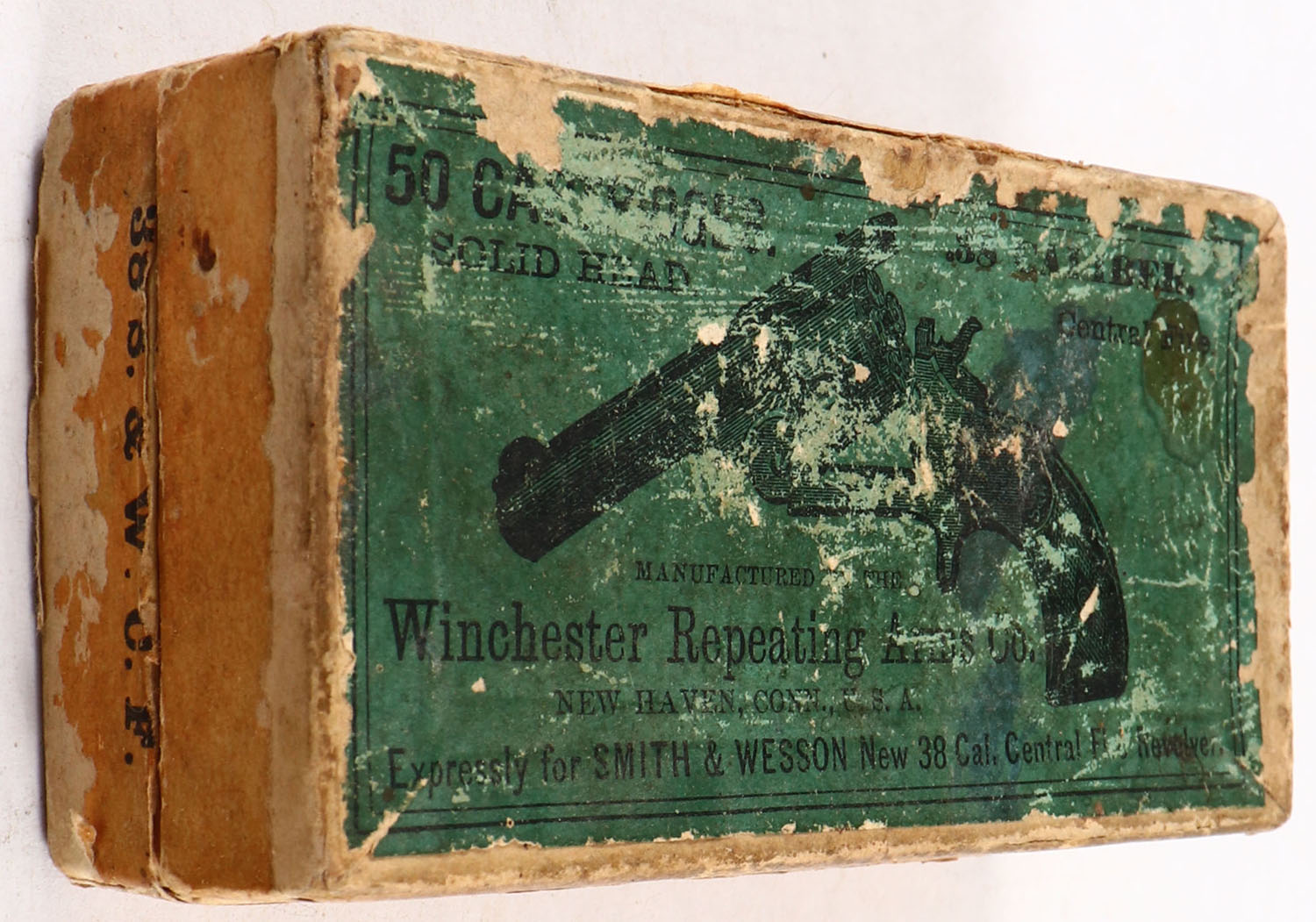 Winchester, .38 Smith & Wesson Center Fire, Partial 20rds. Of incorrect ammo, 2pc. Buff box with green top & orange side sealing labels, box is solid with good color, age soiling, shelf wear, edge & corner wear, labels are 99% intact, ammo is excellent. Grade: Good - Value: 8 to 40
