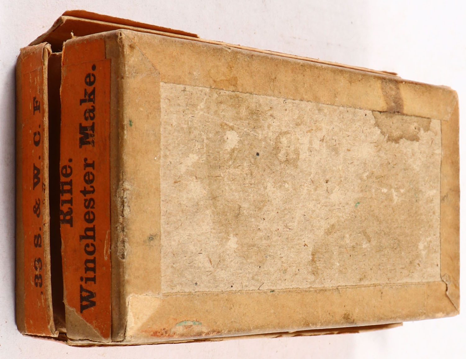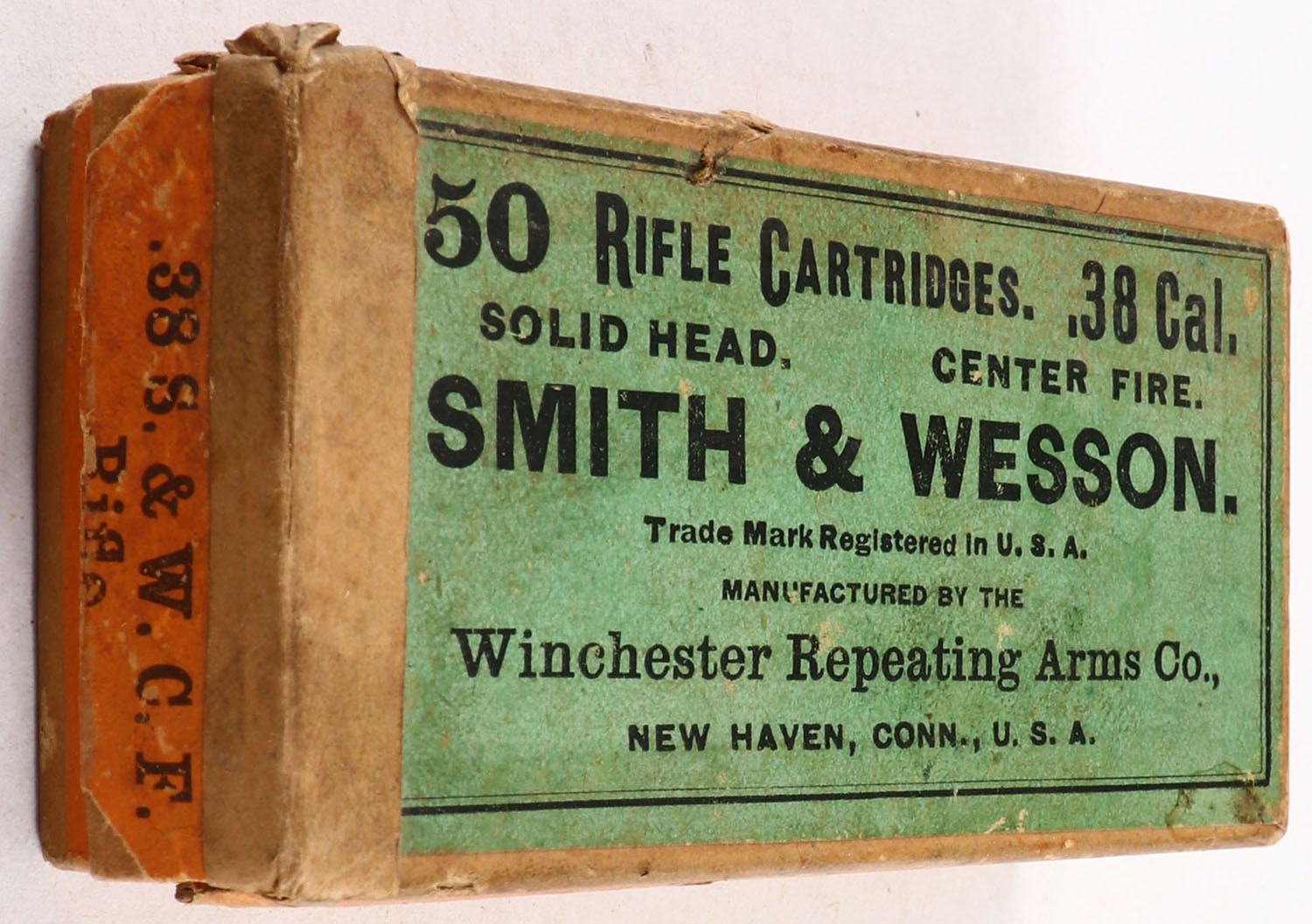 Winchester, Rifle Cartridges, .38 Smith & Wesson, Solid Head, Full, 2pc. Buff box with green top & orange side sealing labels, vertical seam splits to all corners of lid, left end of lid has been torn & taped, very good color, some age soiling & corner wear, minor edge wear, side sealing label is 80% intact, ammo is excellent. Grade: Good ++ - Value: 20 to 60
