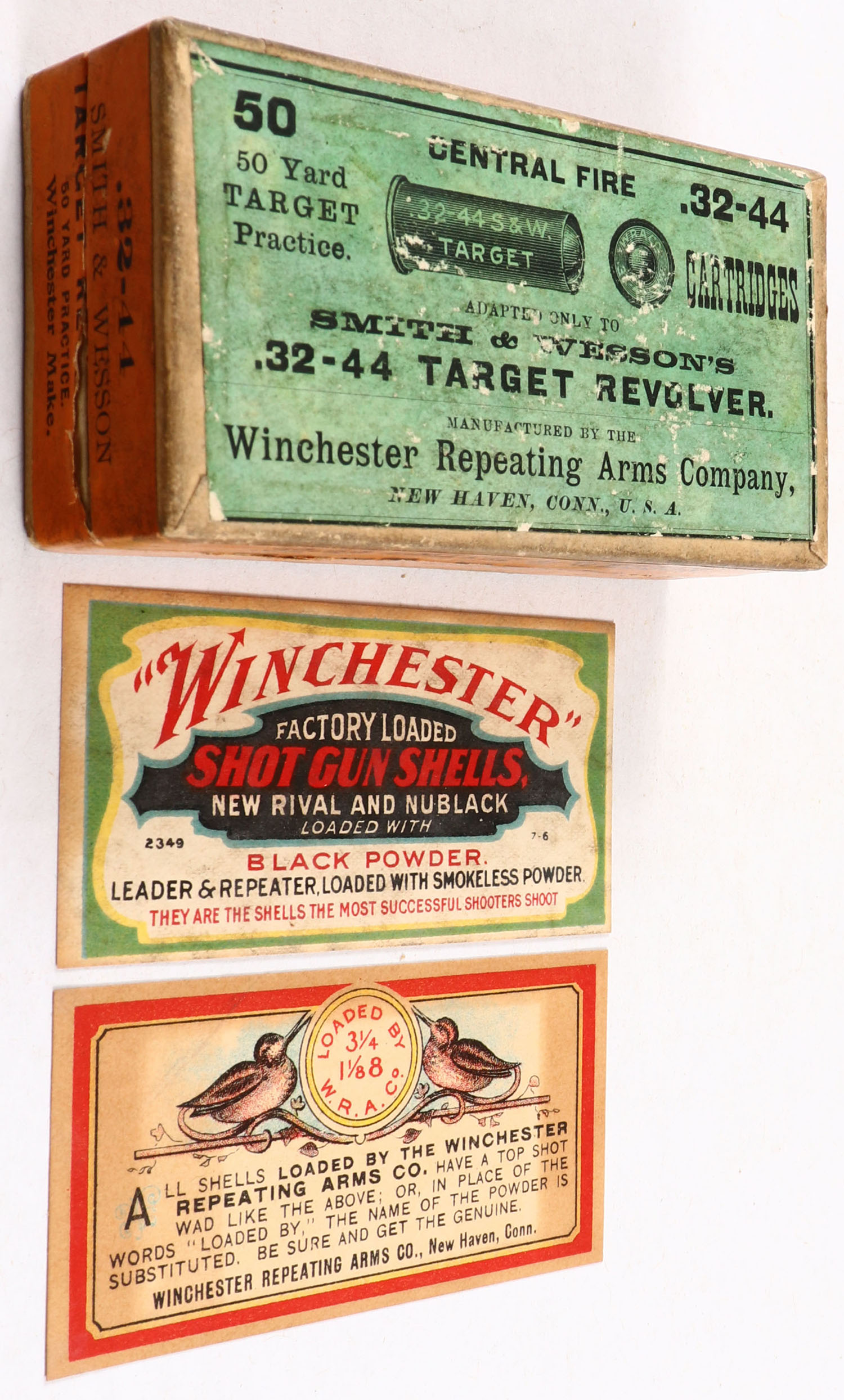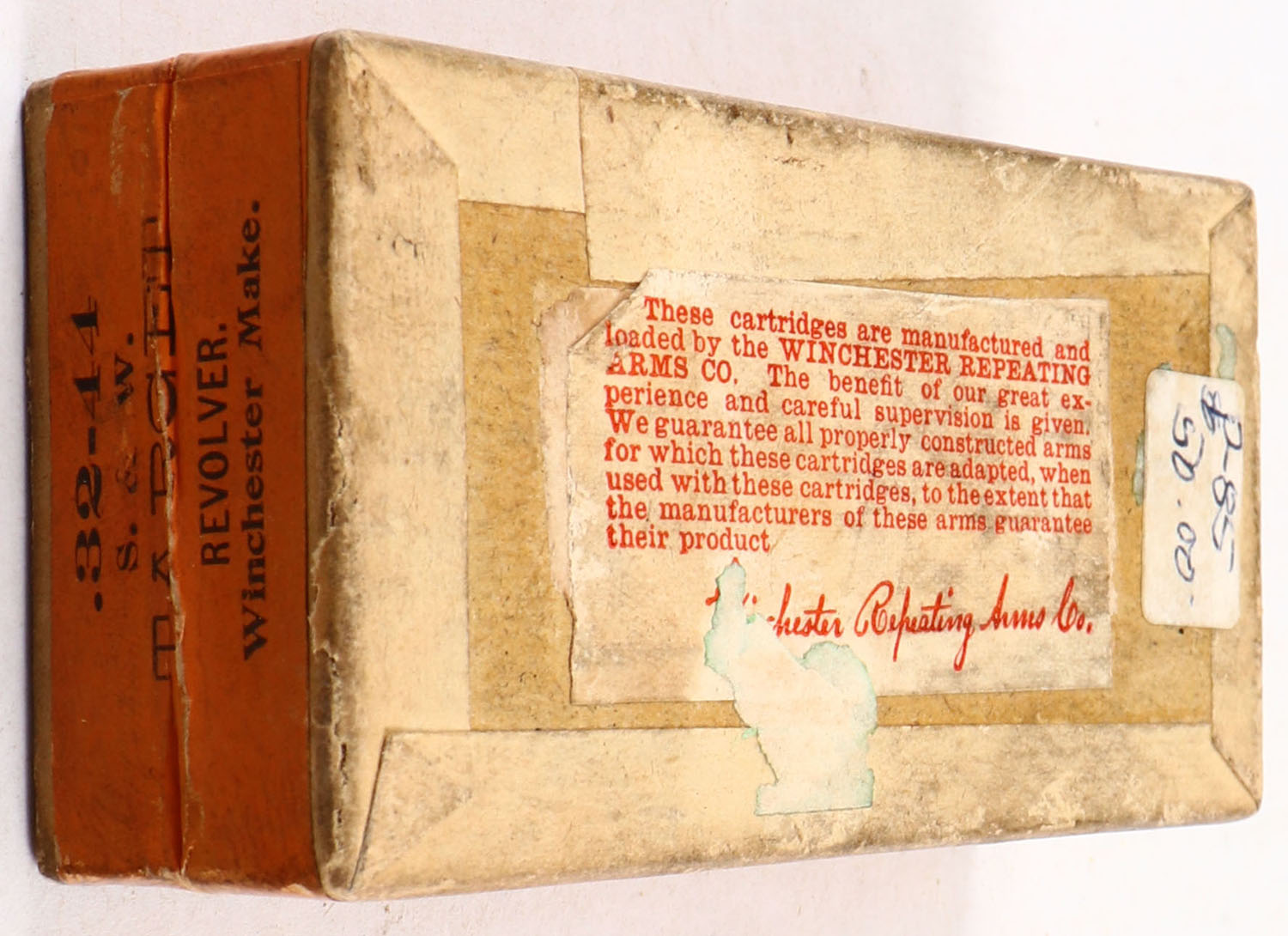 Winchester, Central Fire, .32-44 Smith & Wesson Target, Full with insert, 2pc. Buff box with green top & orange side sealing labels, box is solid with excellent color, minor age soiling & shelf wear, very minor corner wear, edges are crisp, labels are intact, sticker on bottom, insert is minty, ammo is excellent. Grade: Excellent - Value: 50 to 200