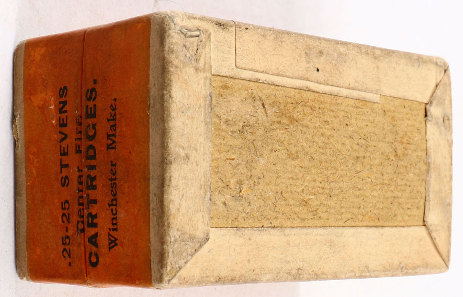 Winchester, Center Fire Cartridges, .25-25 Stevens, FULL & SEALED, 2pc. Buff box with green top & orange side sealing labels, box is solid with excellent color, very minor age soiling & shelf wear, very minor edge & corner wear, labels are intact. Grade: Excellent - Value: 100 to 300