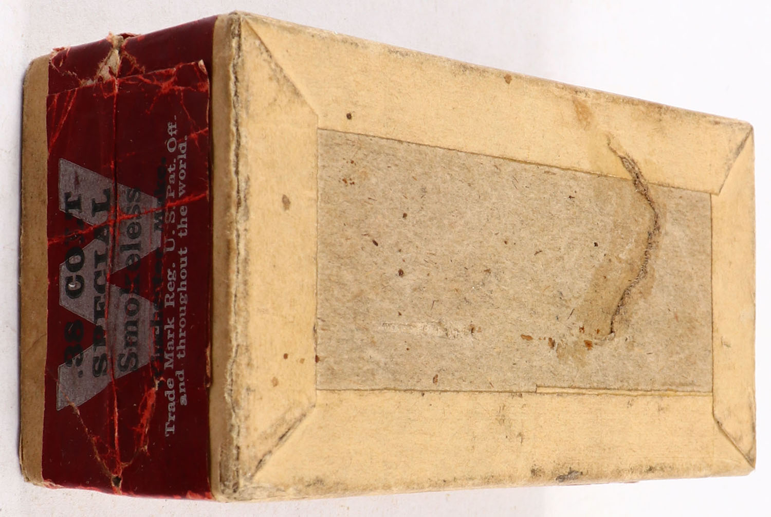 Winchester, Smokeless Powder Cartridges, .38 Colt Special, 158 Gr. Lead Bullet, Full, 2pc. Buff box with red top & side sealing labels, box is solid with excellent color, very minor age soiling, vertical seam split to front left corner of lid, partial seam split to top front edge, minor corner wear, very minor edge wear, labels are intact, ammo is excellent. Grade: Excellent + - Value: 40 to 120