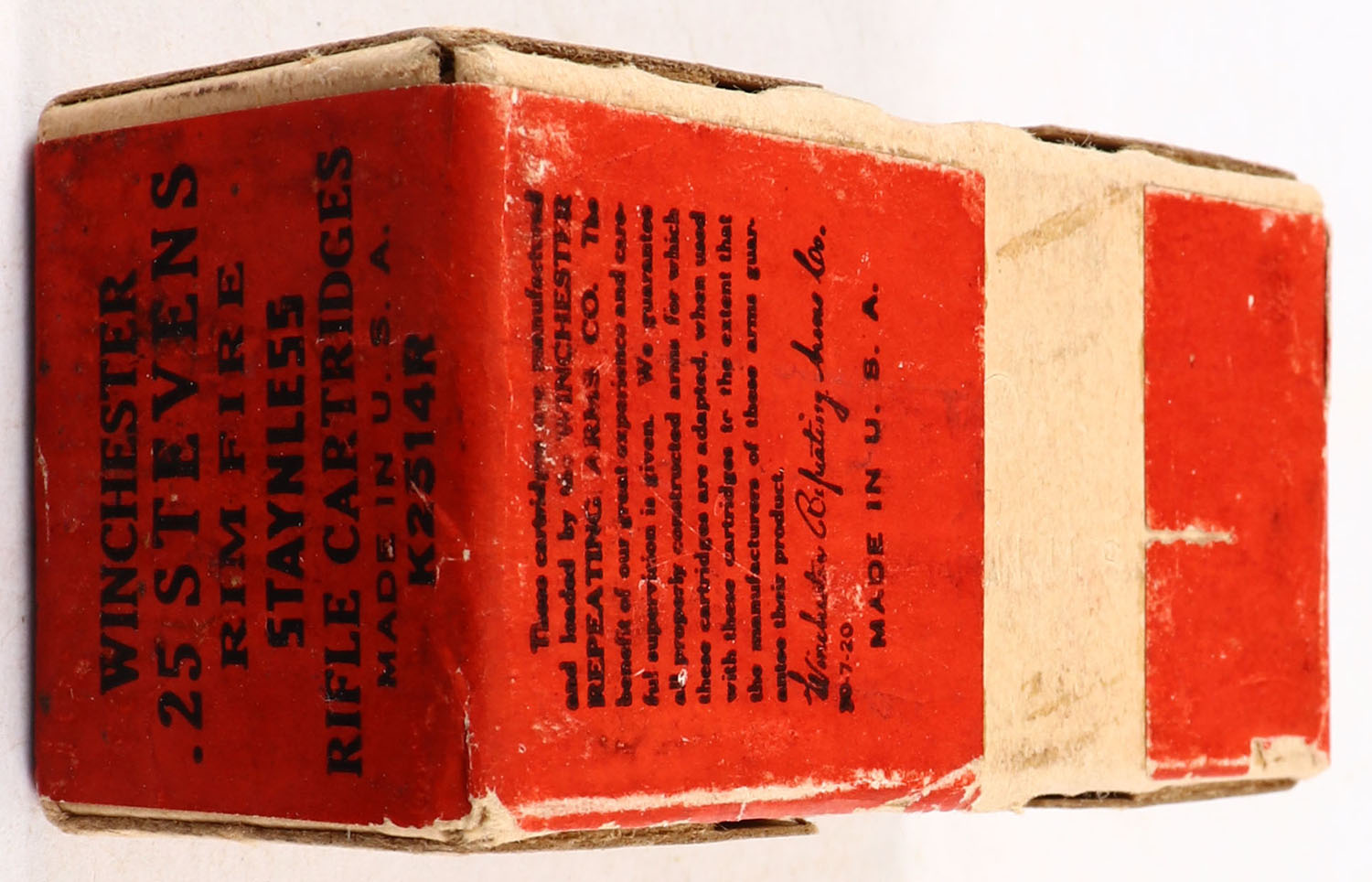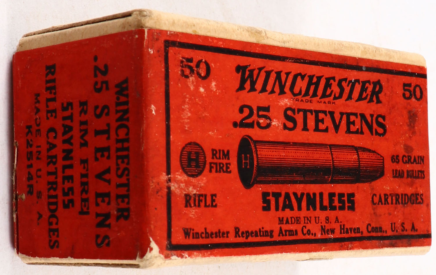 Winchester, Staynless, .25 Stevens Rim Fire, 65 Grain Lead Bullets, FULL & SEALED, 2pc. Buff box with red wraparound label, box is solid with excellent color, minor shelf wear, tape stain on front, very minor corner wear, edges are mostly crisp, label is intact. Grade: Excellent - Value: 80 to 240