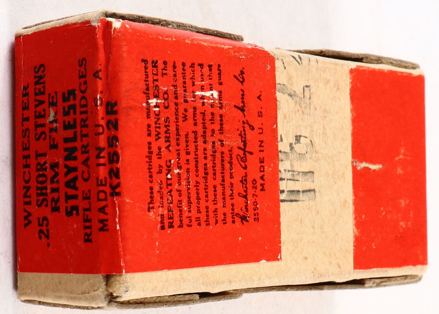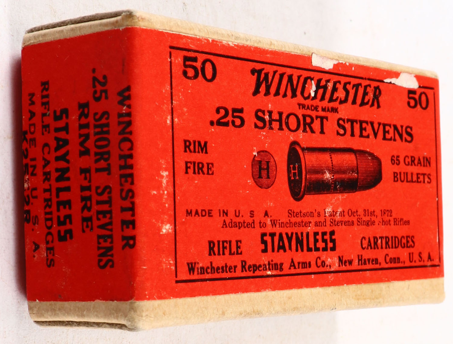 Winchester, Staynless, .25 Short Stevens, Rim Fire, FULL & SEALED, 2pc. Buff box with red wraparound label, box is near mint with mint color, very minor shelf wear, corners are mostly sharp, edges are crisp, label is intact. Grade: Excellent ++ - Value: 100 to 300