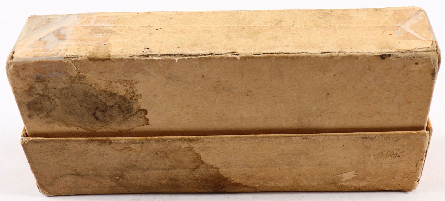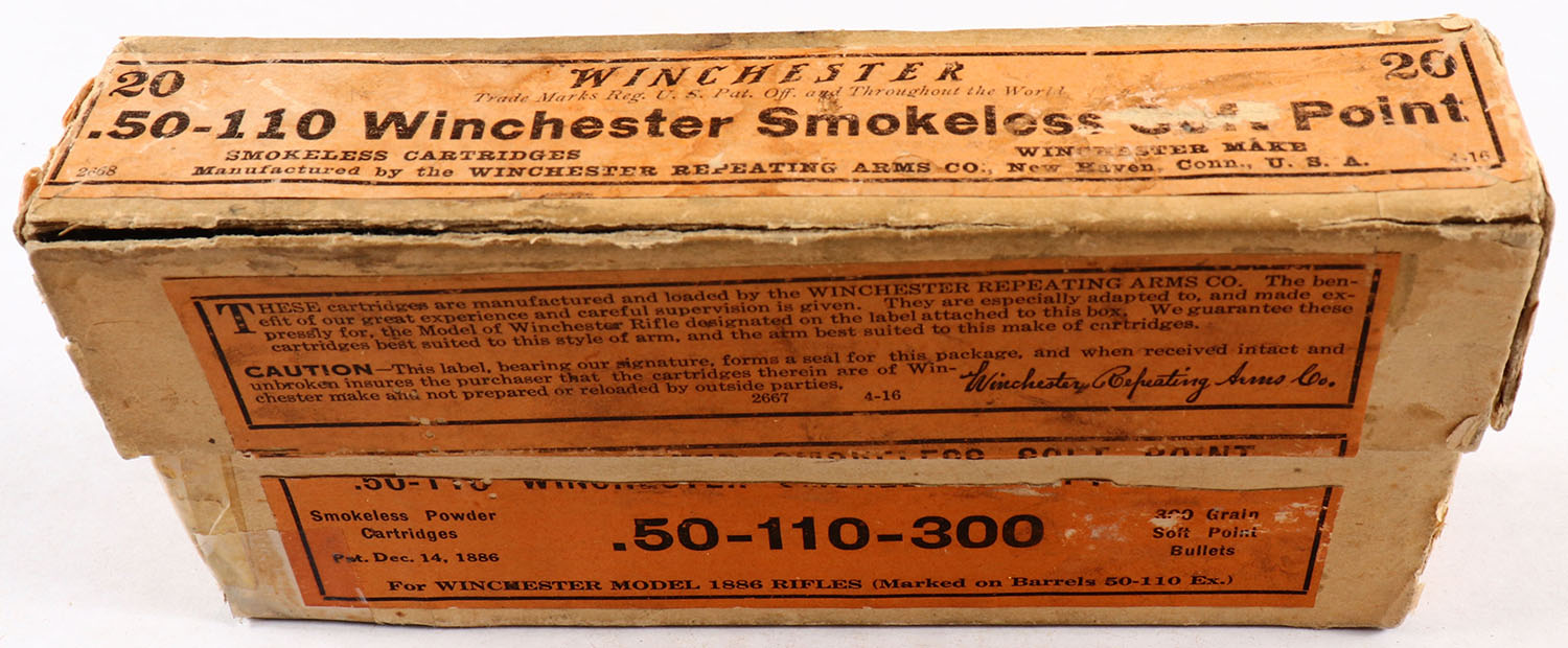 Winchester, Smokeless Cartridges, .50-110, 300 Grain Soft Point Bullets, Partial 18rds. Of mixed ammo, 2pc. Buff box with orange labels, box is solid with good to very good color, some age soiling & color fading, lid has several repaired seam splits, staining on back side, edge wear, corner wear, labels are intact, ammo is very good to excellent. Grade: Good ++ - Value: 50 to 200