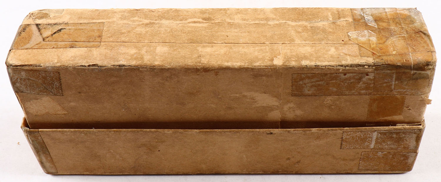 Winchester, Smokeless Powder Cartridges, .38-56 Winchester, 255 Gr. Soft Point Bullets, Full, 2pc. Buff box with orange labels, box is solid with very good color, minor age soiling & color fading, tape on both ends, some edge & corner wear, labels are intact, ammo is very good. Grade: Very Good - Value: 150 to 300