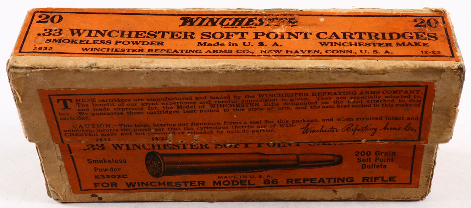 Winchester, Soft Point Cartridges, .33 Winchester, 200 Grain Soft Point Bullets, Smokeless Powder, Partial 16rds. 2pc. Buff box with orange labels, box is solid with very good color, some age soiling, edge & corner wear, labels are intact, ammo is very good. Grade: Very Good - Value: 30 to 120