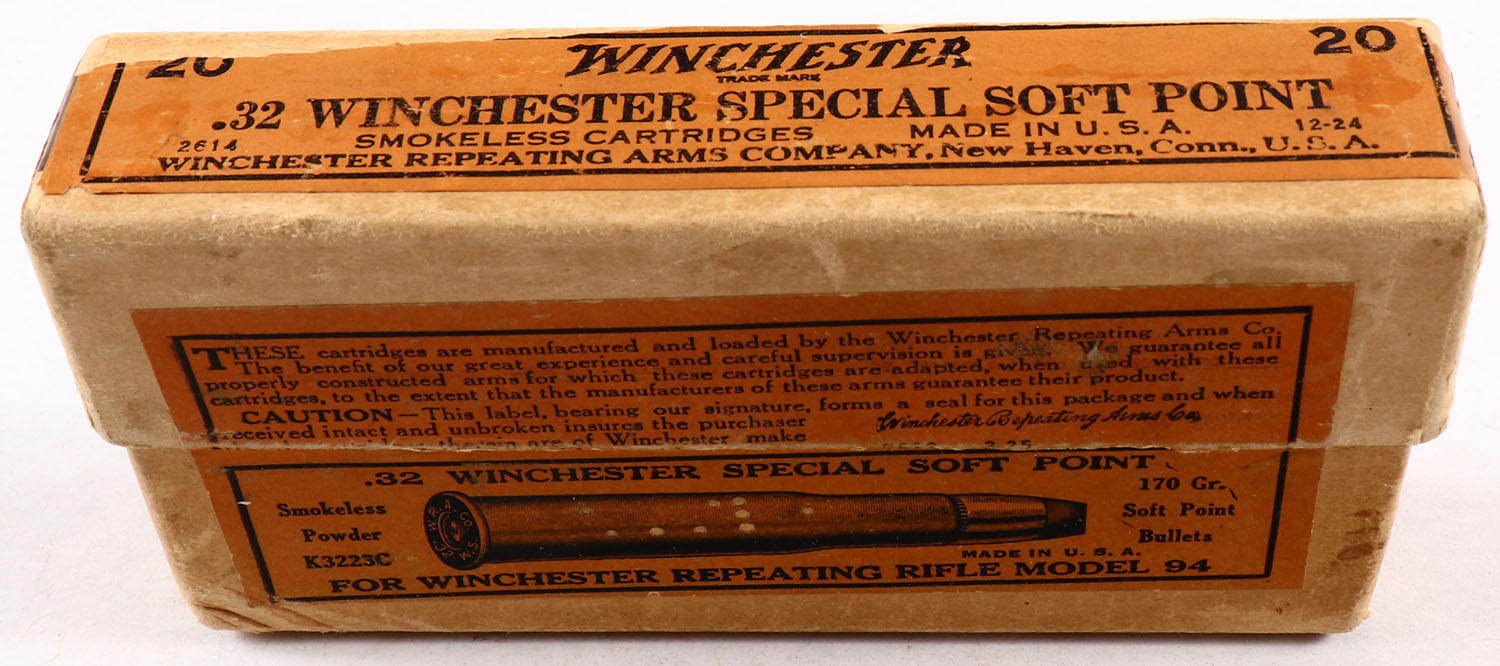Winchester, Smokeless Cartridges, .32 Winchester Special, 170 Gr. Soft Point Bullets, Full, 2pc. Buff box with orange labels, box is solid with excellent color, very minor color fading, minor edge & corner wear, labels are intact, ammo is very good to excellent. Grade: Excellent - Value: 30 to 90