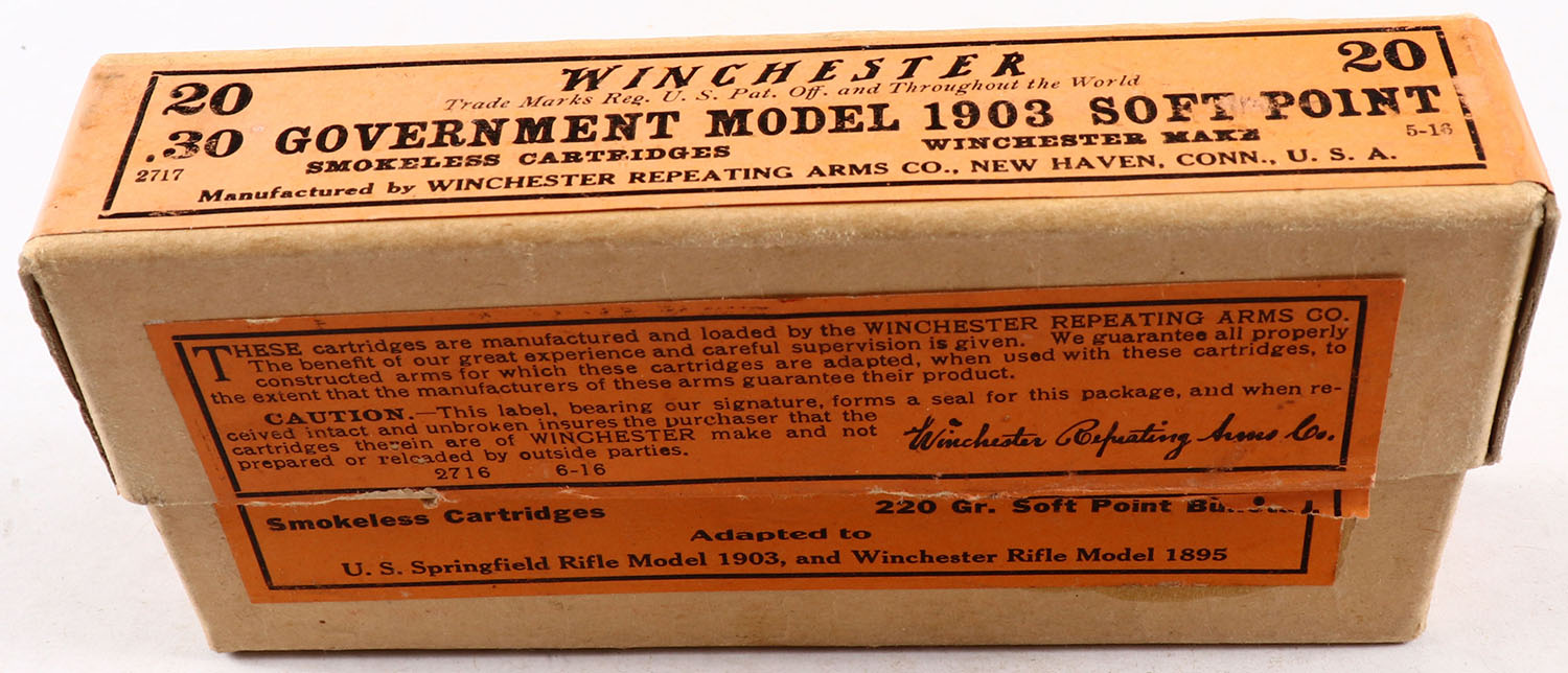 Winchester, Smokeless Cartridges, .30 Government Model 1903 (30-03), 220 Gr. Soft Point Bullets, Empty, 2pc. Buff box with orange labels, box is solid with excellent color, some color fading to top, very minor corner wear, edges are crisp, labels are intact. Grade: Excellent + - Value: 8 to 40