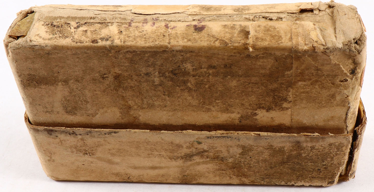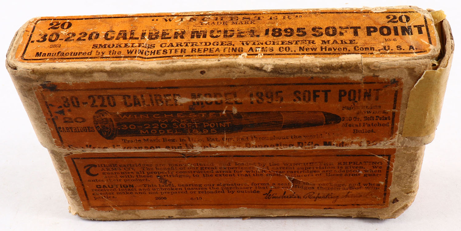 Winchester, Smokeless Cartridges, .30-220, 220 Gr. Soft Point Metal Patched Bullet, Partial 19rds. Correct, 2pc. Buff box with orange labels, box is solid with very good color, some age soiling, shelf wear, edge & corner wear, labels are intact, ammo is excellent. Grade: Good ++ - Value: 30 to 90