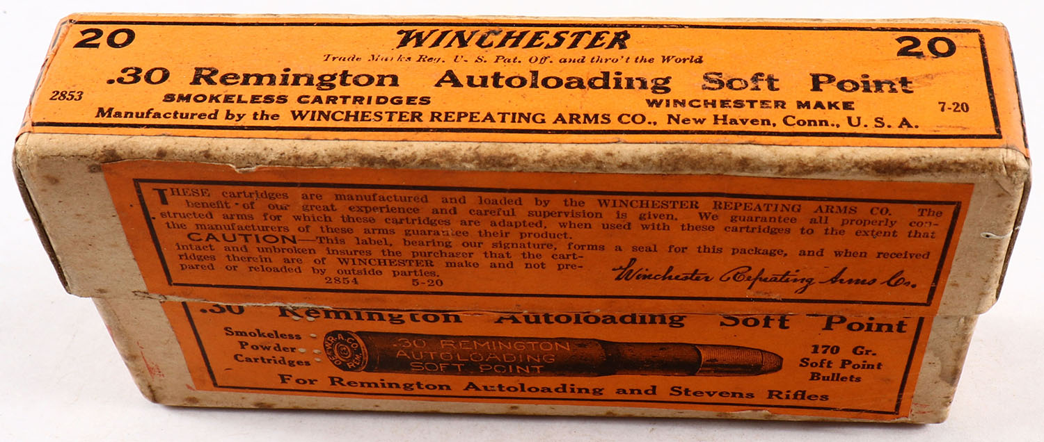 Winchester, Smokeless Cartridges, .30 Remington Autoloading, 170 Gr. Soft Point Bullets, Full, 2pc. Buff box with orange labels, box is solid with excellent color, very minor age soiling, some staining, minor edge & corner wear, labels are intact, ammo has cracked necks. Grade: Very Good ++ - Value: 20 to 60